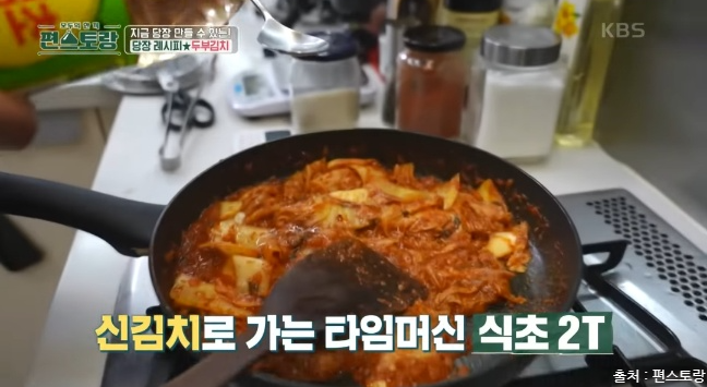 김치가 생김치라 신김치로 만들기 위해 식초 2T를 넣어줍니다. 신김치일 경우에는 식초를 패스해 주세요. 냄새가 묵은지 볶은 냄새로 변신을 합니다.