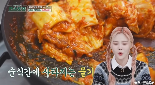 5분간 찐 김치는 배추 줄기에서 나오는 수분으로 다시 물이 많아집니다. 중불로 다시 볶아줍니다.