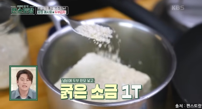 냄비에 두부 한모를 넣고 굵은소금 1T를 넣고 물은 두부가 완전히 잠길 정도로 채워주세요.