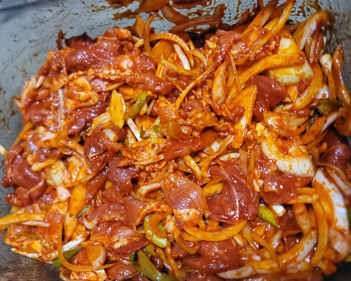 고춧가루 2T를 추가해서 섞어줍니다. 저는 다음날 어머님네 가져가야 했어서 하루 재워놓을 거예요. 고기랑 채소랑 양념 무쳐서 바로 구워드셔도 맛있어요.