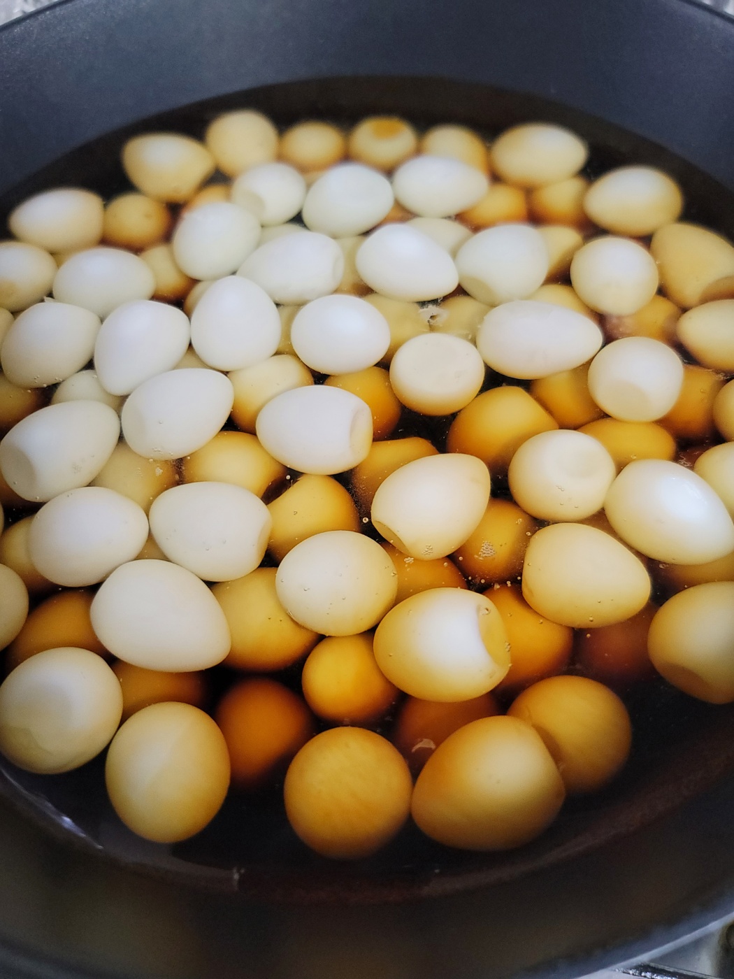 냄비에 깐메추리알과 물을 자작하게 준비합니다.
