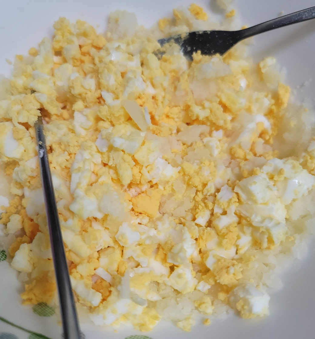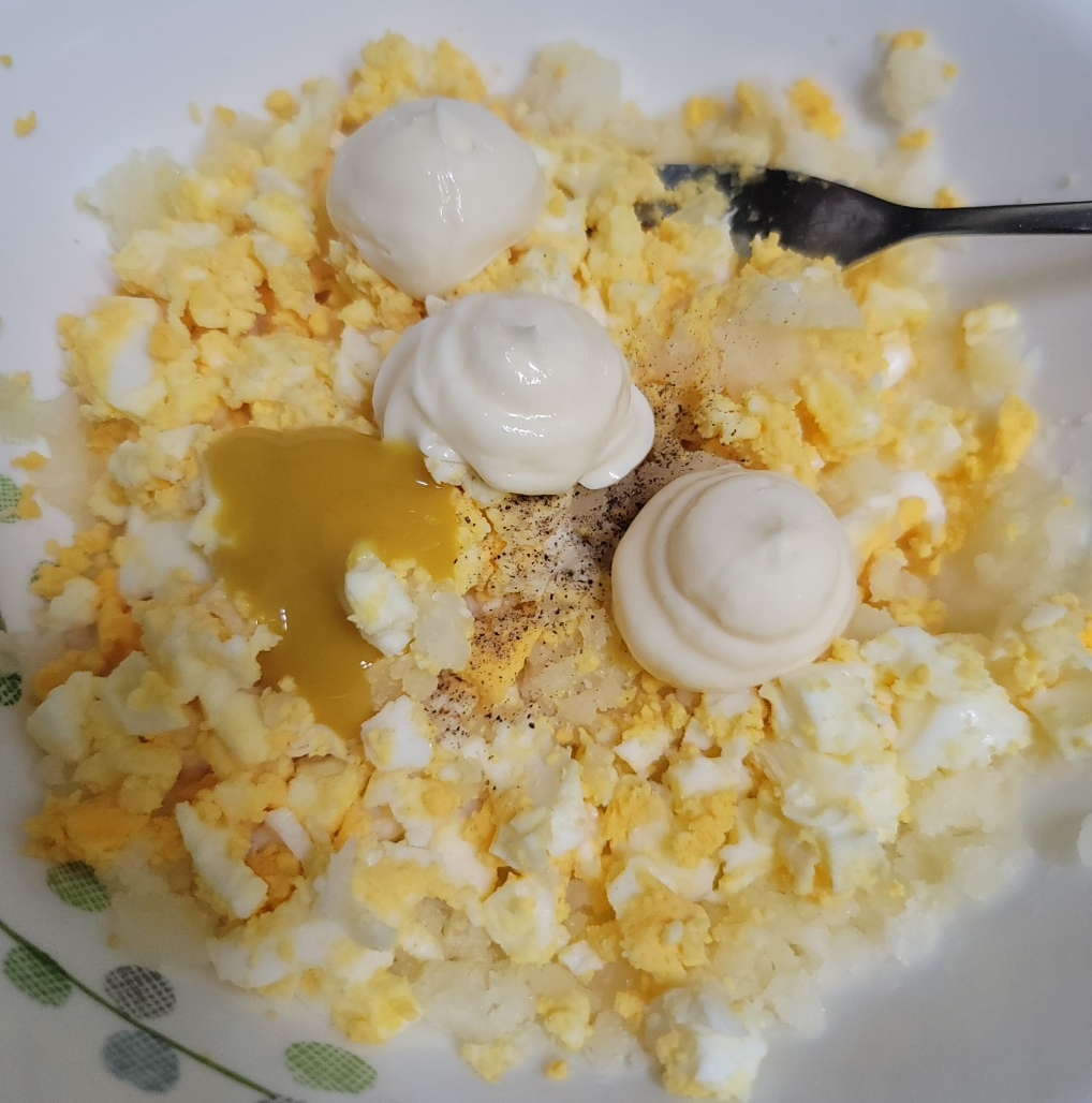 계란도 잘 삶아졌네요. 껍질을 벗기고 감자 위에 살포시 올려줍니다.
