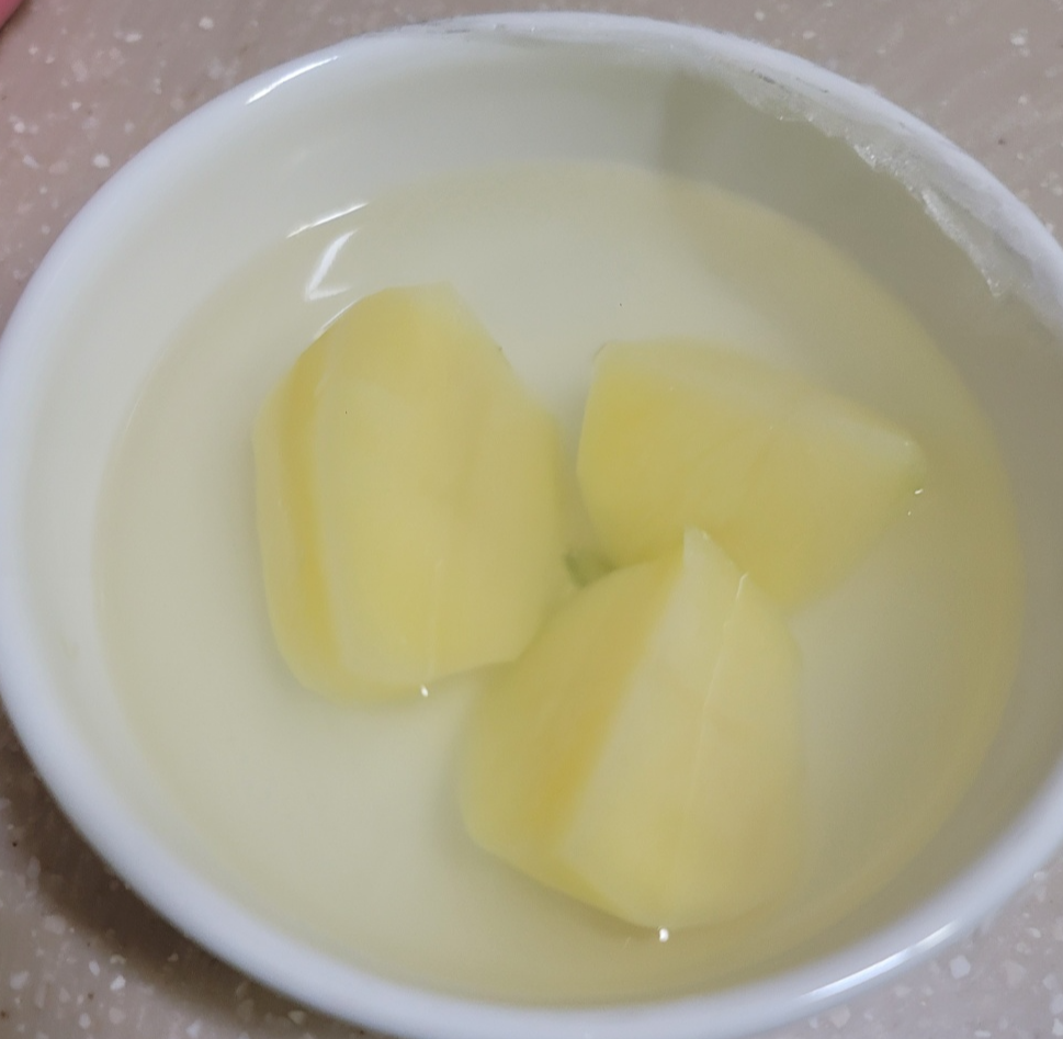 껍질을 손질하고 3등분해서 감자가 물이 잠길 정도로 넣고 랩을 씌워줍니다. 구멍을 몇 개 뚫어주고 전자레인지에 넣고 3분 30초 돌려줍니다.