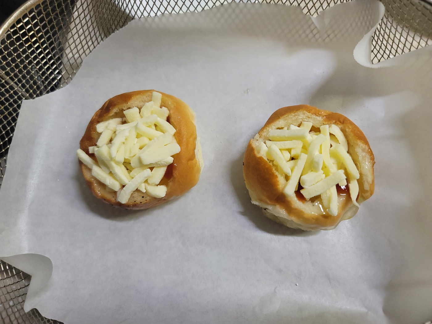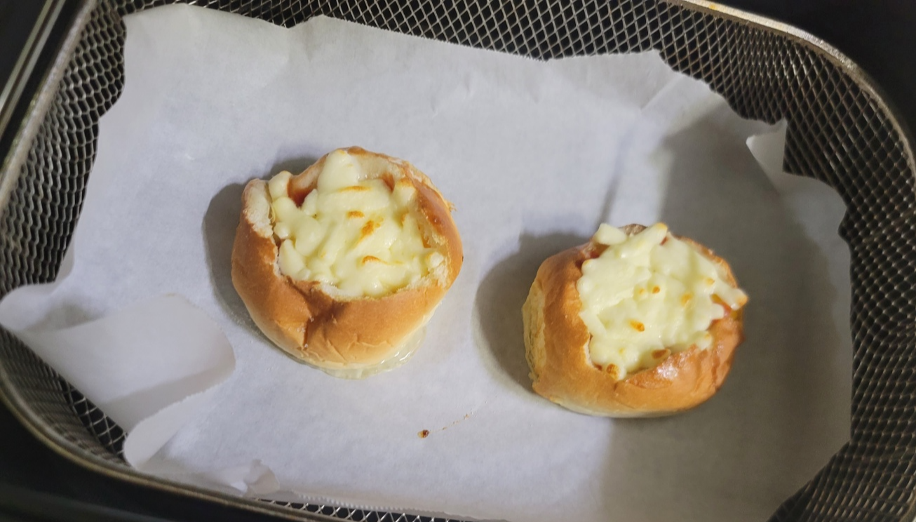 치즈와 모닝빵 겉면이 바삭하게 구워졌어요. 군침이 돕니다.