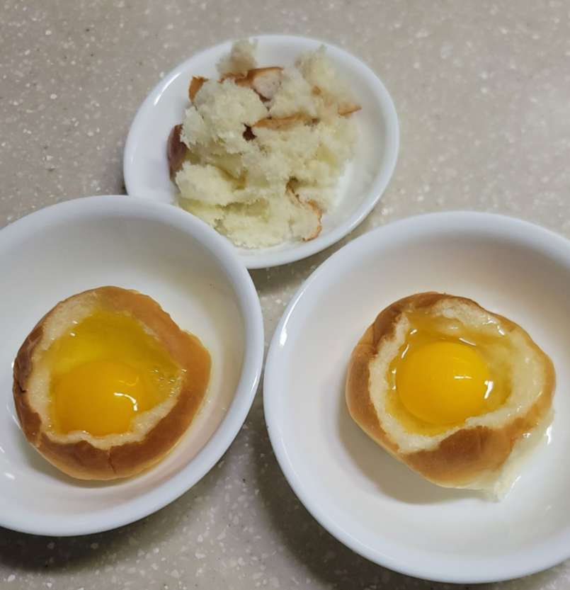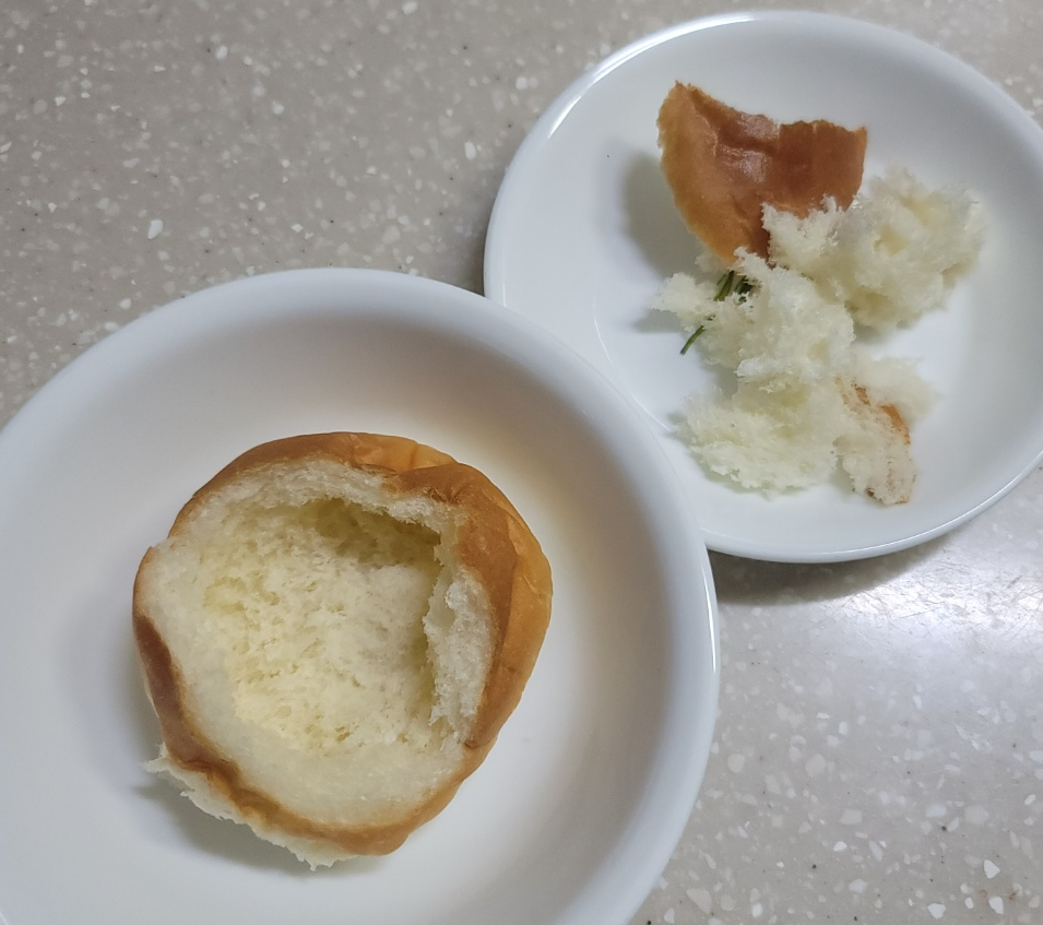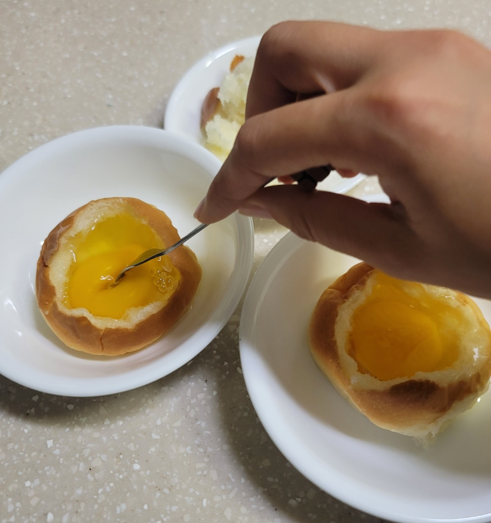 모닝빵을 준비해 줍니다. 계란을 담아내기 위해 속을 빠네 빵처럼 옴폭하게 파줍니다.