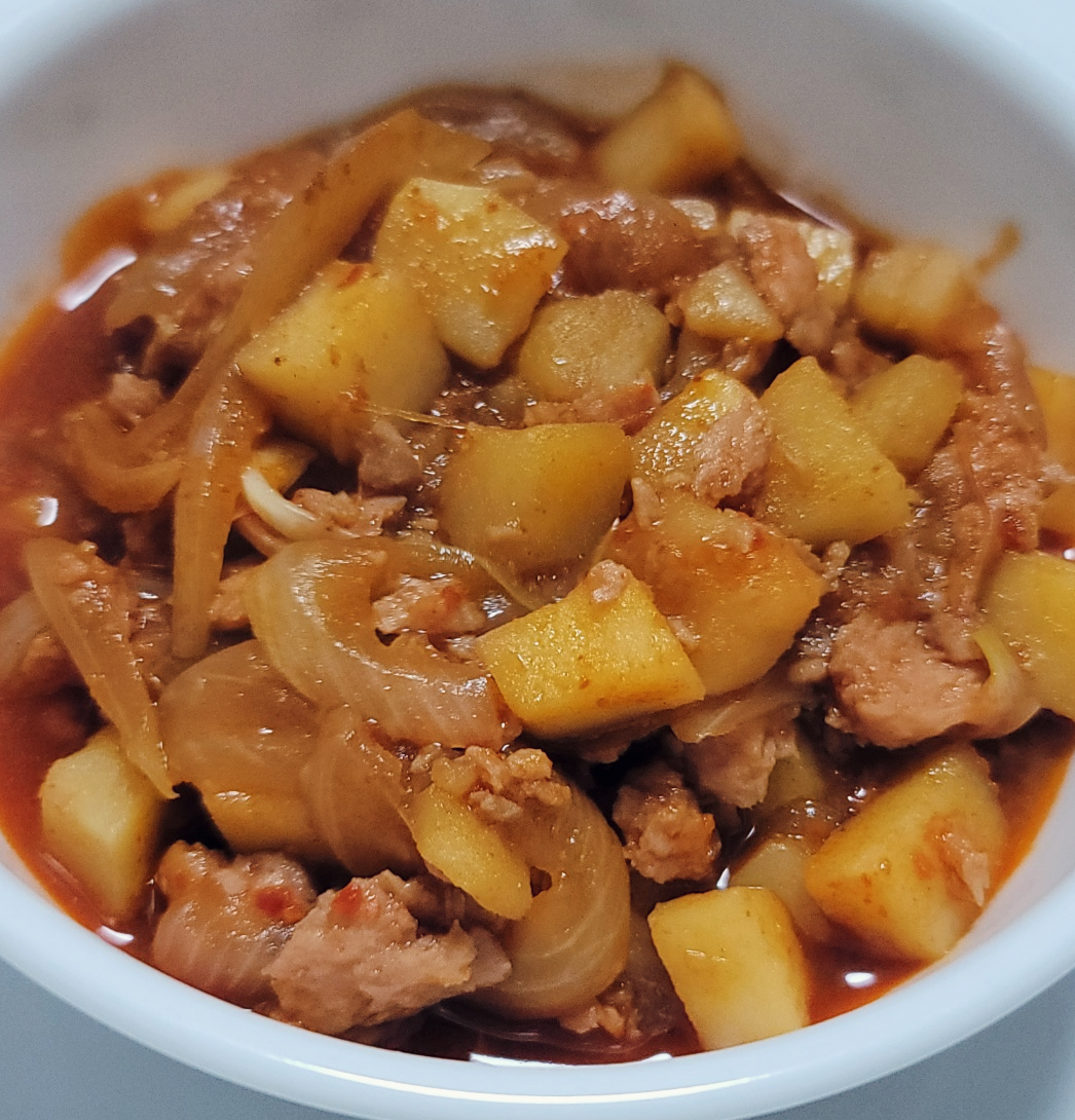 스팸 200g, 감자 2개, 양파 반 개, 진간장 2T, 참치액젓 1T, 설탕 1T, 고추장 1T, 된장 1/2T, 다진마늘 1T, 고춧가루 2T, 맛술 1T (밥숟가락 기준)