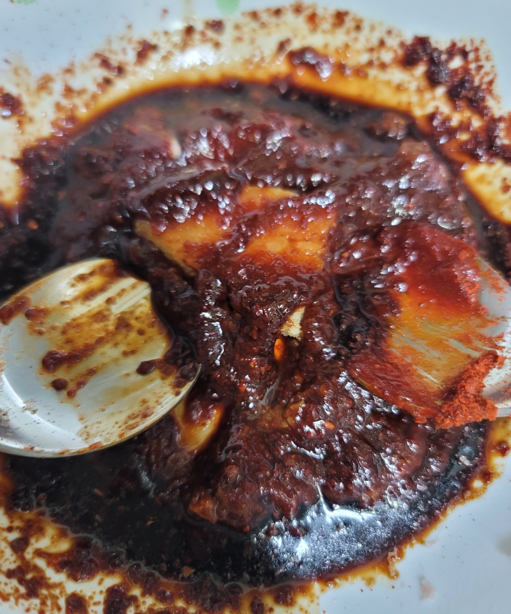 설탕 1T를 넣어주고 레시피에서 가장 중요한 고추장 1T, 된장 1/2T를 넣어줍니다. 된장을 넣어주면 깊은 맛이 올라옵니다. 꼭 같이 넣어주세요. 된장 향이 남지 않고 깔끔해져요. 마지막으로 고춧가루 2T를 넣고 섞어줍니다.
