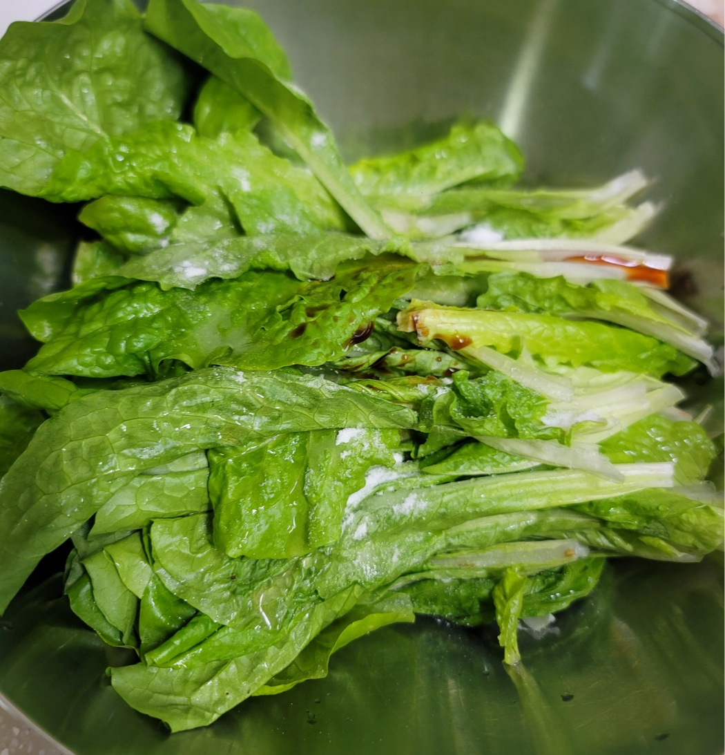 상추를 흐르는 물에 꼼꼼하게 씻어줍니다. 냉장고에 보관해서 시들해진 상추라면 찬물에 잠시 담가두면 다시 싱싱하게 변합니다. 뿌리 부분에 흙이 많이 묻어있으니 한 장씩 뜯어 꼼꼼하게 씻어줍니다. 물기를 최대한 제거하고 먹기 좋게 손으로 잘라줍니다. 까먹고 안 잘랐다가 양념이랑 섞을 때 힘들었어요. 꼭 잘라서 준비해 주세요.