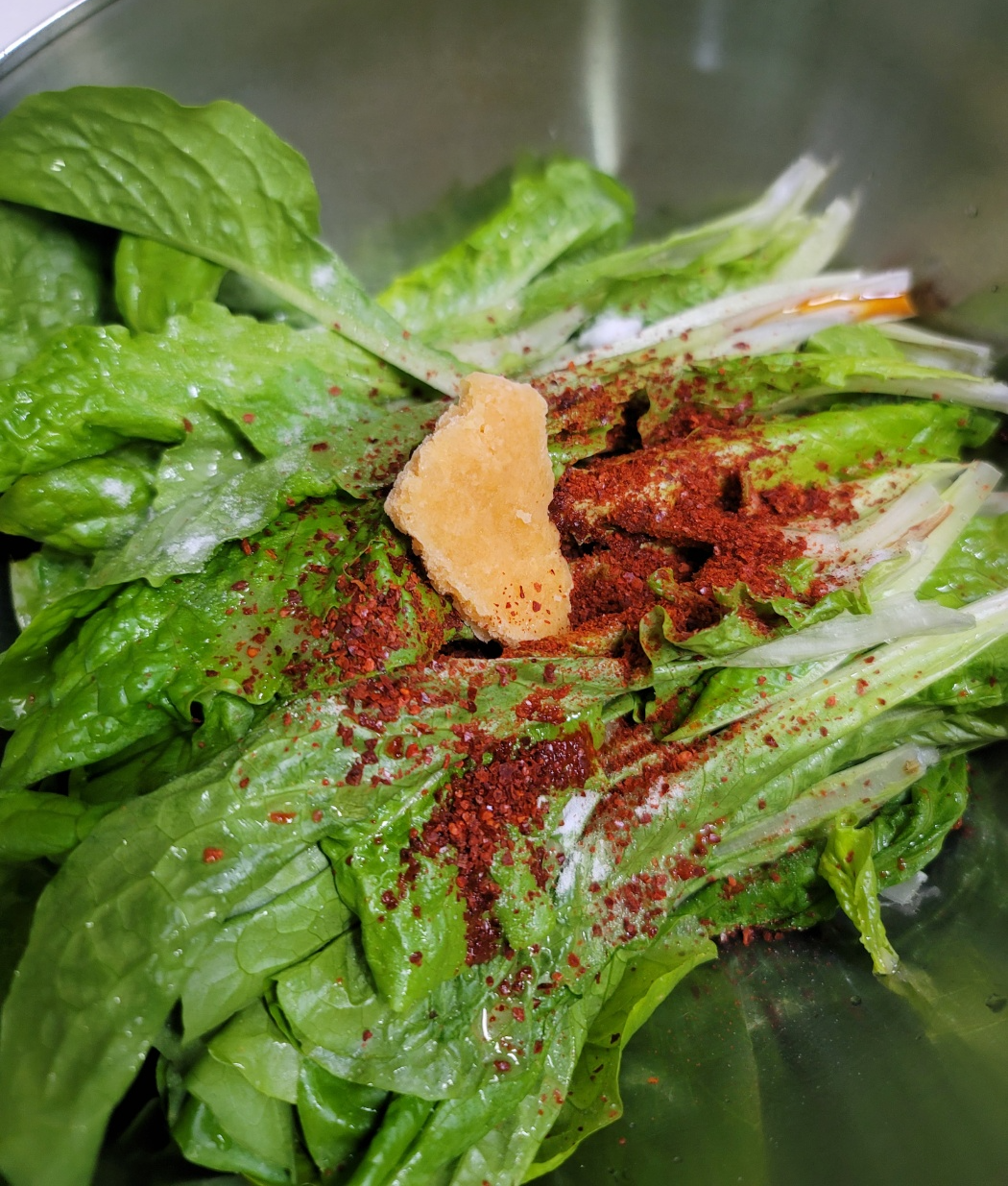 상추 두 주먹, 설탕 1T, 식초 1T, 까나리액젓(참치액, 멸치액젓대체가능) 1T, 진간장 3T, 고춧가루 3T, 다진마늘 1T, 다진생강 조금