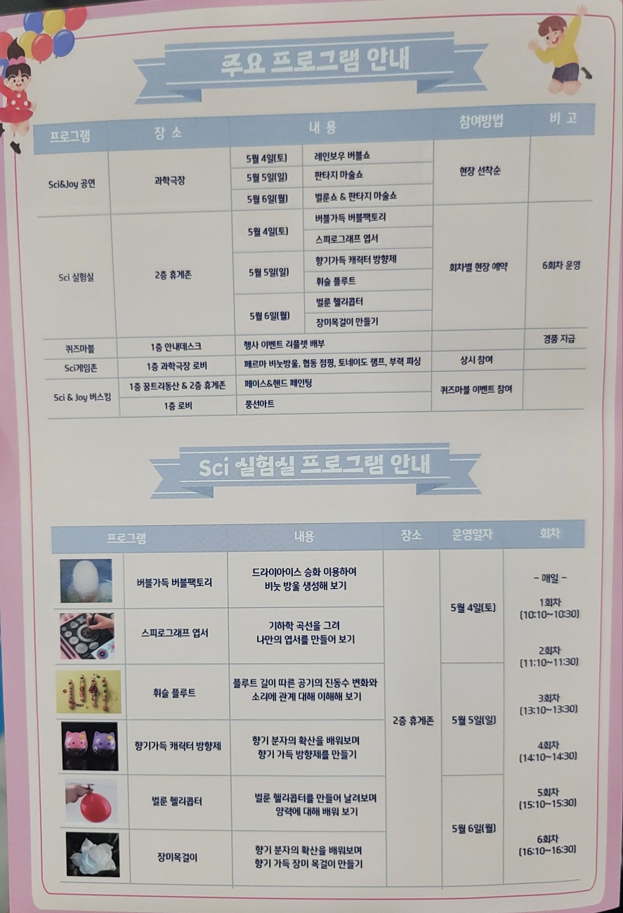 어린이날 연휴라 행사가 많았어요. Sci실험실 프로그램을 예약하고 마술을 보러 1층 과학극장으로 갔어요. 프로그램이나 공연 모두 선착순이라 프로그램은 미리 예약하고 공연도 미리 줄 서있는 게 좋아요.