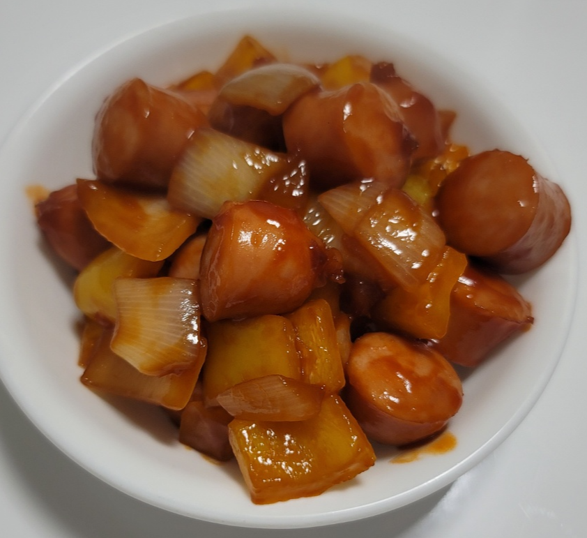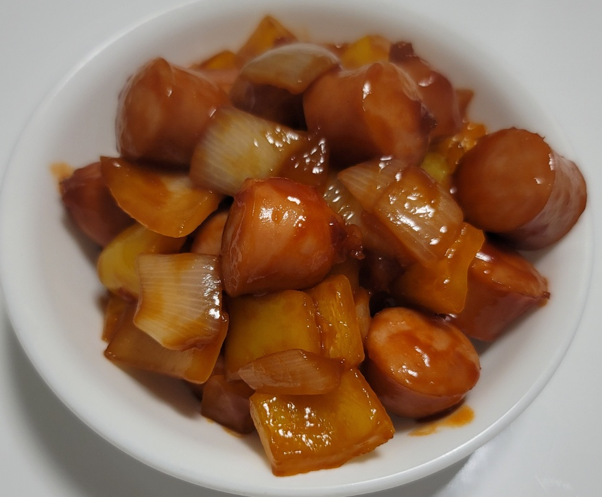 소세지 15개, 파프리카 1개, 양파 1개, 진간장 2T, 설탕 2T, 케첩 4T, 식초 1T