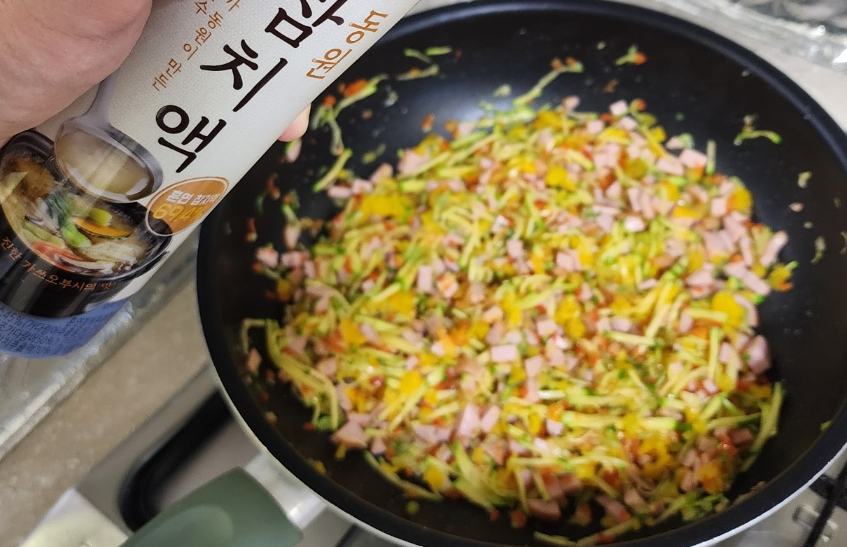 애호박, 파프리카를 깨끗하게 씻어줍니다. 애호박 1/3개를 아주 얇게 채썰어주세요. 파프리카 1/3개도 아주 작게 다져줍니다. 단무지는 반주먹정도 물기를 꽉 짜서 잘게 썰어주고 소세지도 단무지처럼 마찬가지로 잘게 썰어 준비해 줍니다. 집에 다른 야채가 있다면 손질해서 작게 썰어서 준비해 주세요.