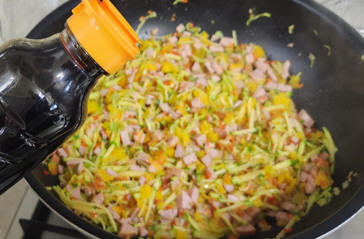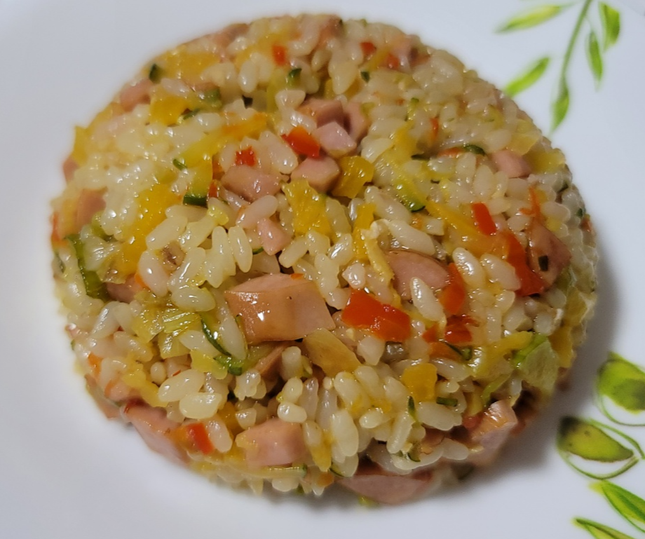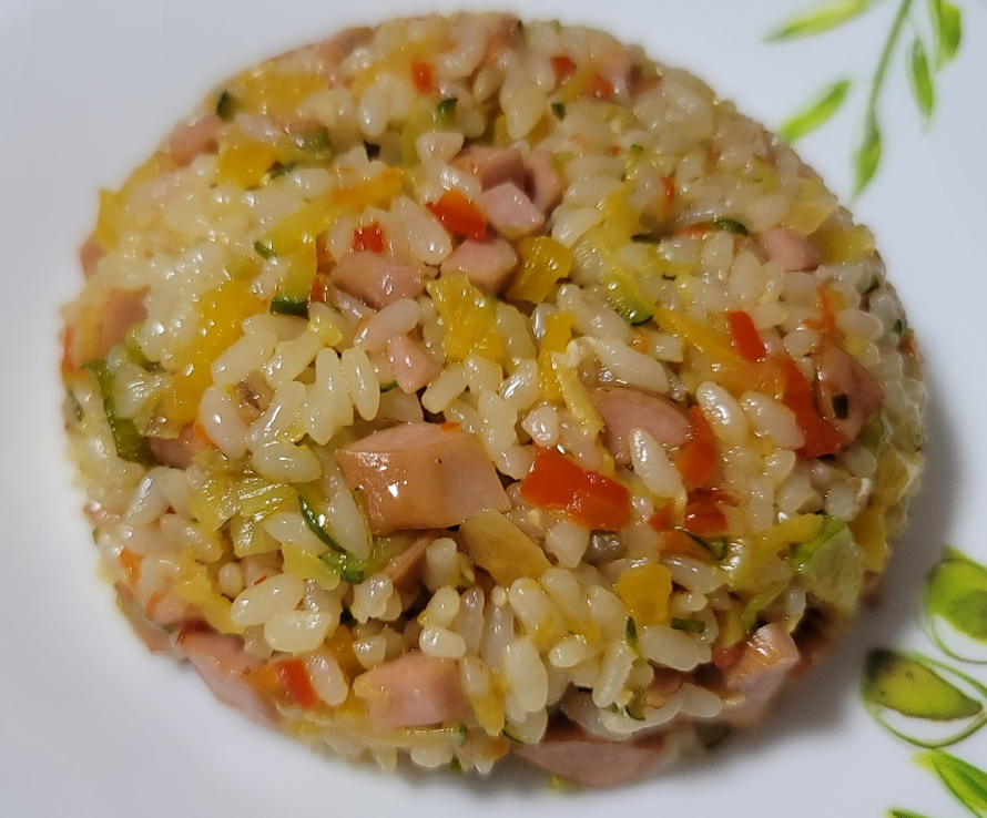 밥 두공기, 애호박 1/3개, 파프리카 1/3개, 소시지 100g, 다진 마늘 1T, 단무지 반주먹, 파 1/2개, 식용유 4T, 소금 두 꼬집, 참치액젓 1t, 간장 1T, 참기름 1T(밥 숟가락 기준, 참치액젓만 티스푼기준)