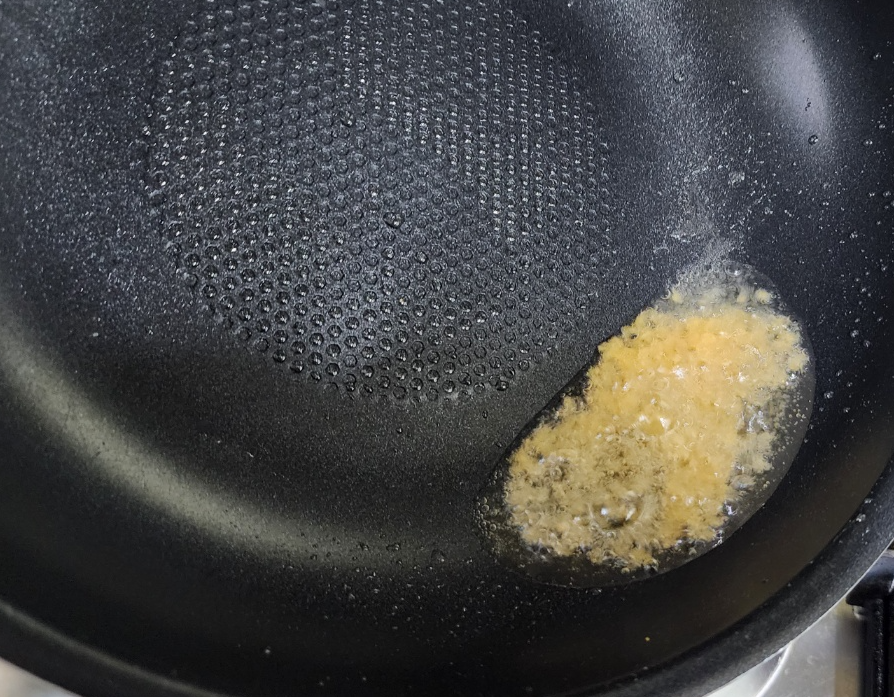 팬에 식용유 4T를 넣고 다진 마늘 1T를 먼저 볶아주세요. 이때 마늘이 타지 않게 중불로 해주세요. 얇게 썬 파도 넣어줍니다.
