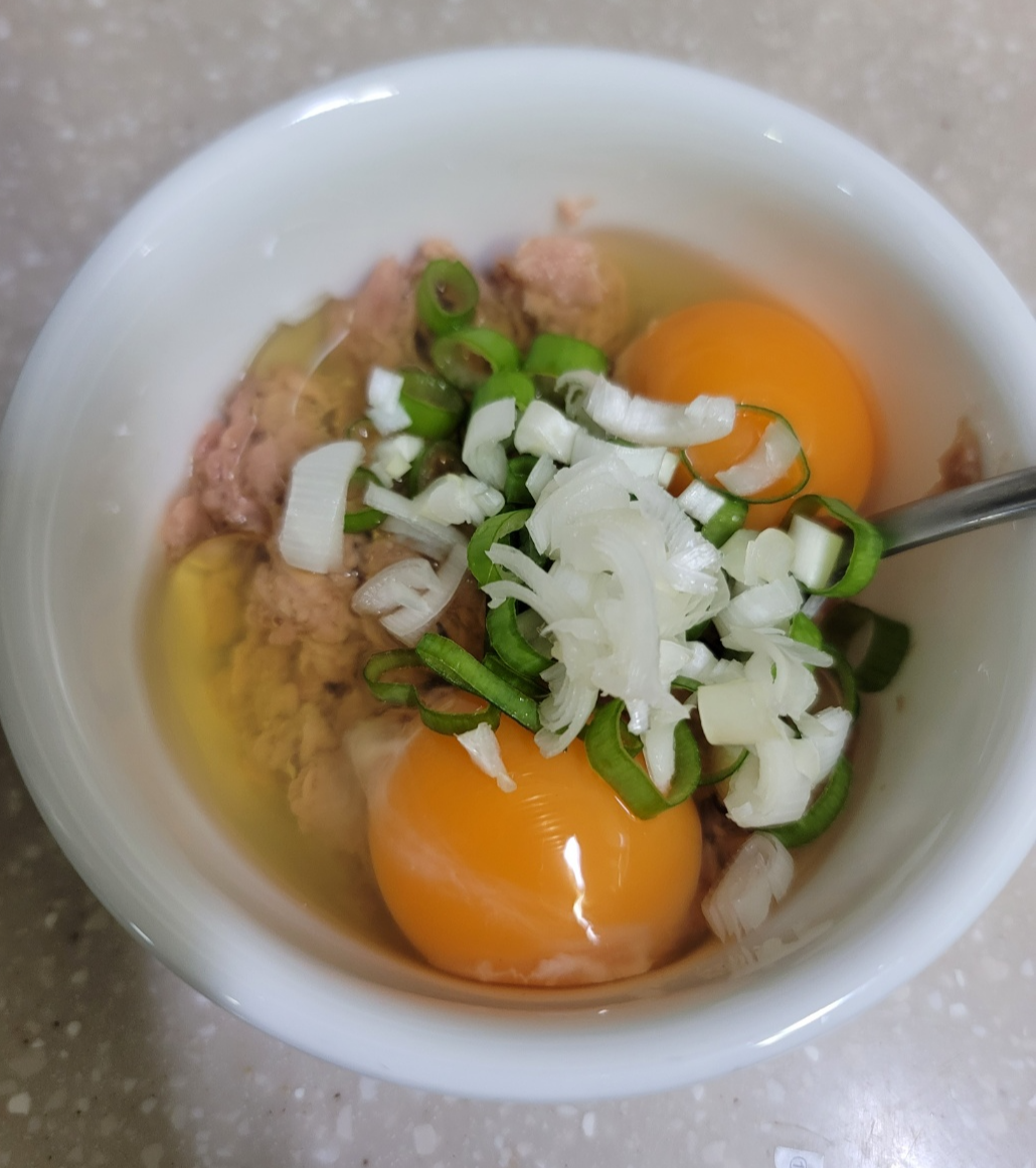 과정이 많이 생략되었네요. 참치에 기름을 많이 빼서 그릇에 넣어줍니다. 달걀을 톡 깨서 두 알 넣어줍니다. 달걀이 싱싱한지 노른자가 탱글 하네요. 대파를 파란 부분 흰 부분 골고루 섞어서 작게 쫑쫑 썰어서 넣어줍니다.