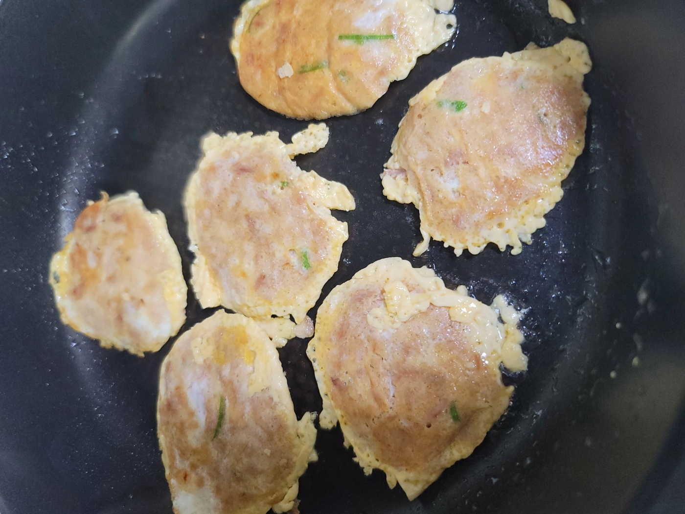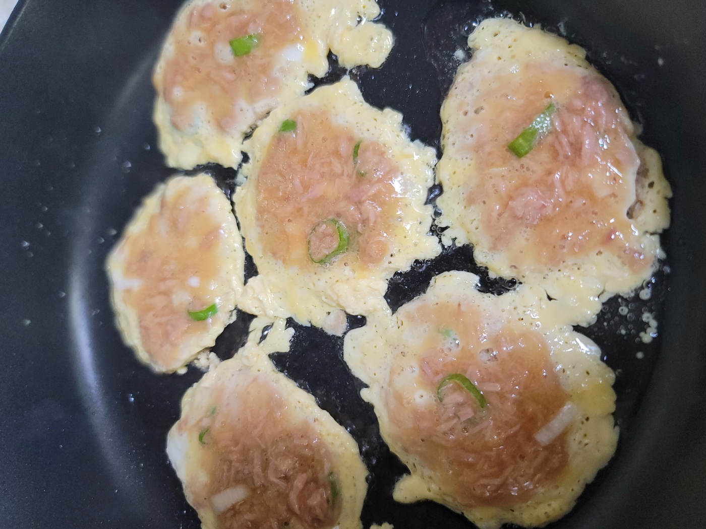 이 타이밍입니다. 계란 겉 부분에 구멍이 뽕뽕 나면 뒤집어주세요!