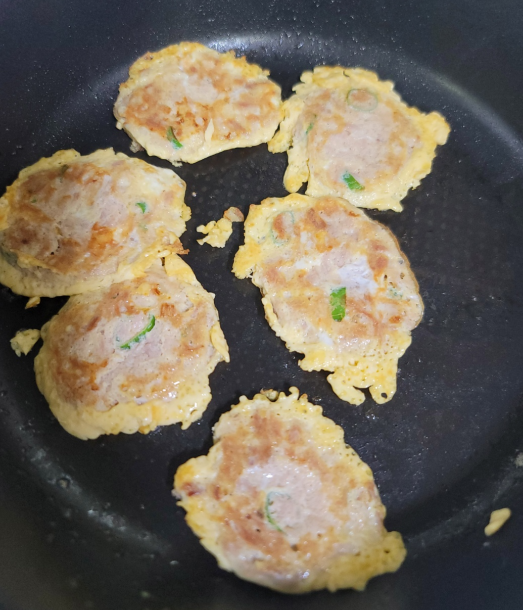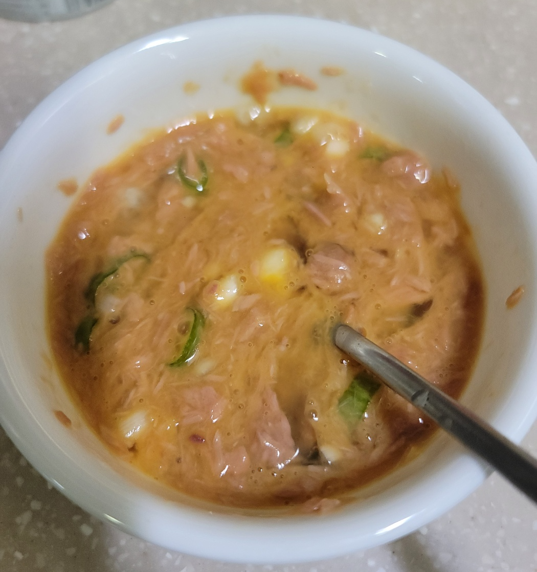친정엄마가 어릴 때 꼭 파를 썰어 넣어줬던 게 기억에 남아요. 그래서 저도 파를 넣어봤습니다. 없으시면 생략해도 됩니다. 소금도 조금 톡톡 해줬는데요. 참치전 먹을 때 케첩을 찍어 먹기 때문에 소금도 생략해도 됩니다.