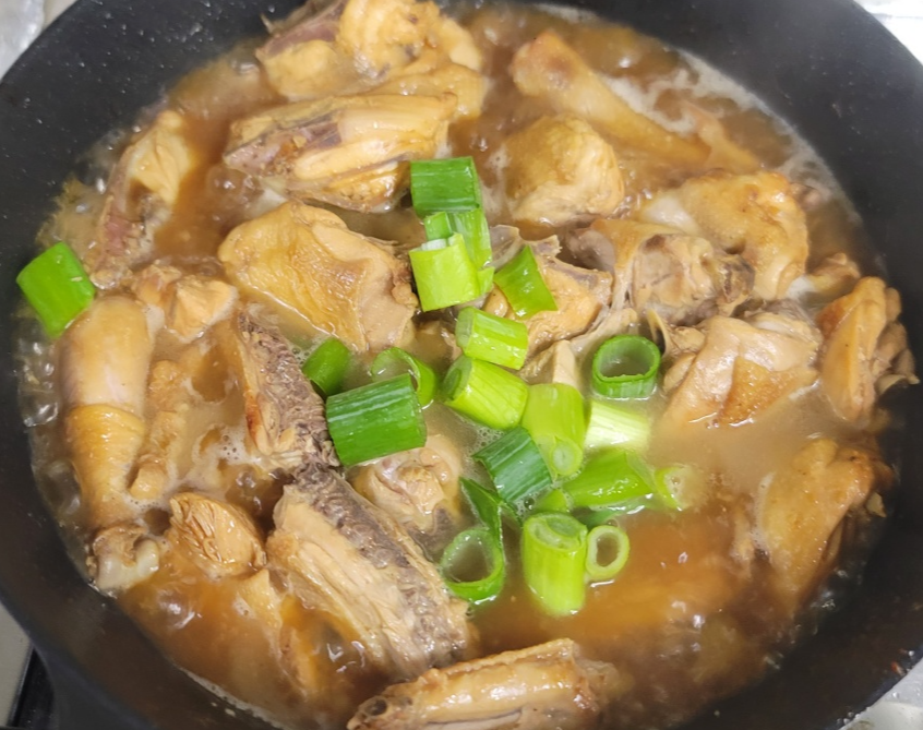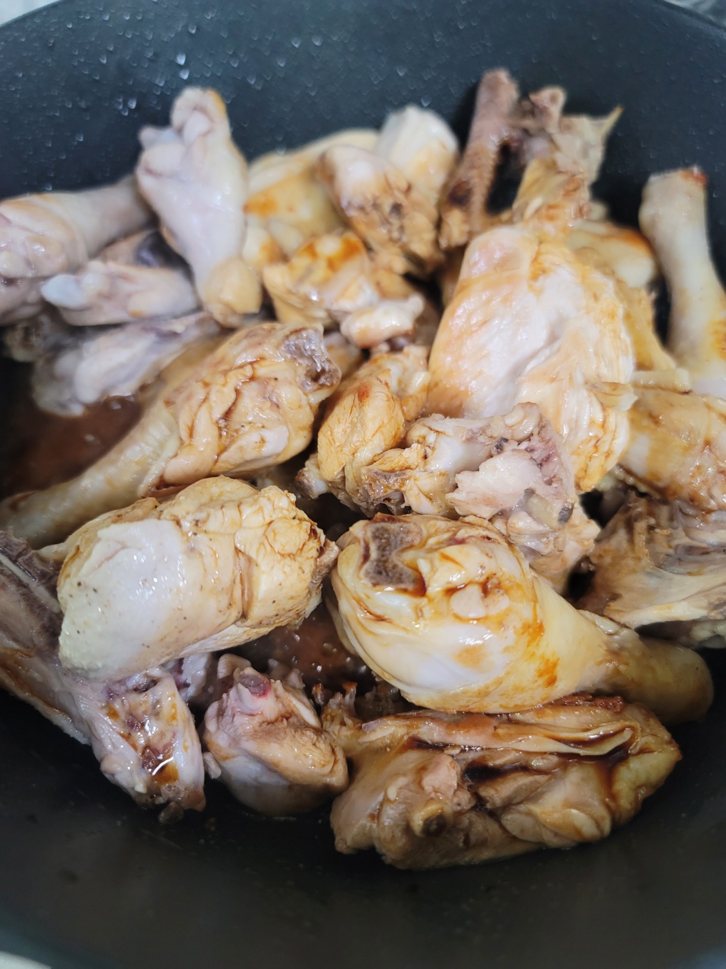 닭 두 마리를 같이 넣고 간장 9T를 넣고 끓여줍니다. 간장이 끓으면 다진마늘 1.5T를 넣어줍니다.