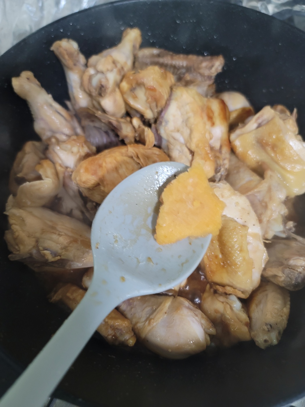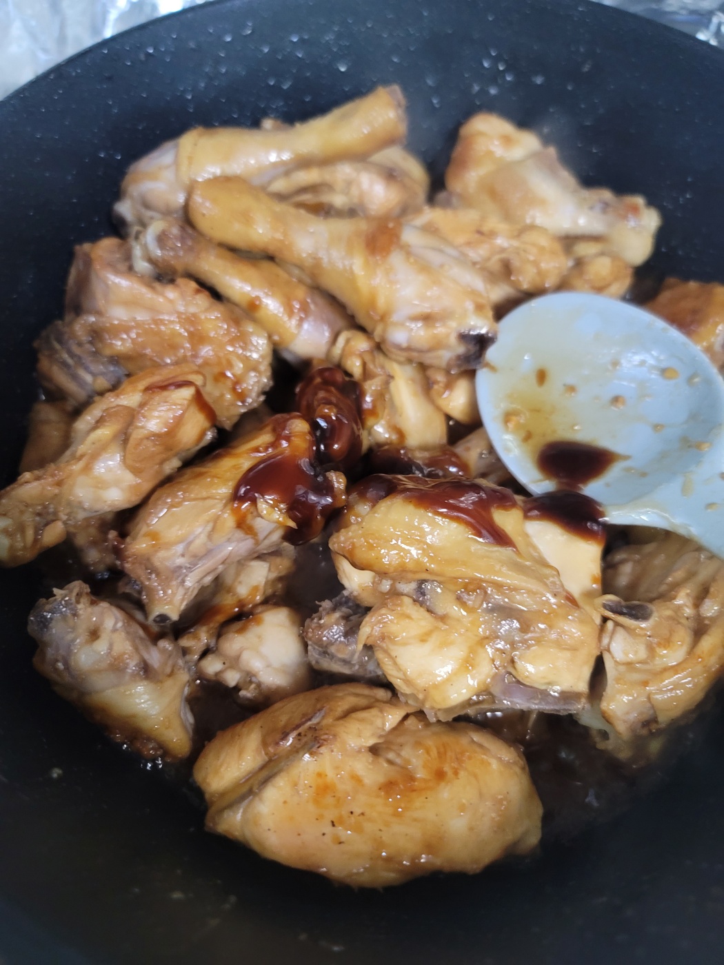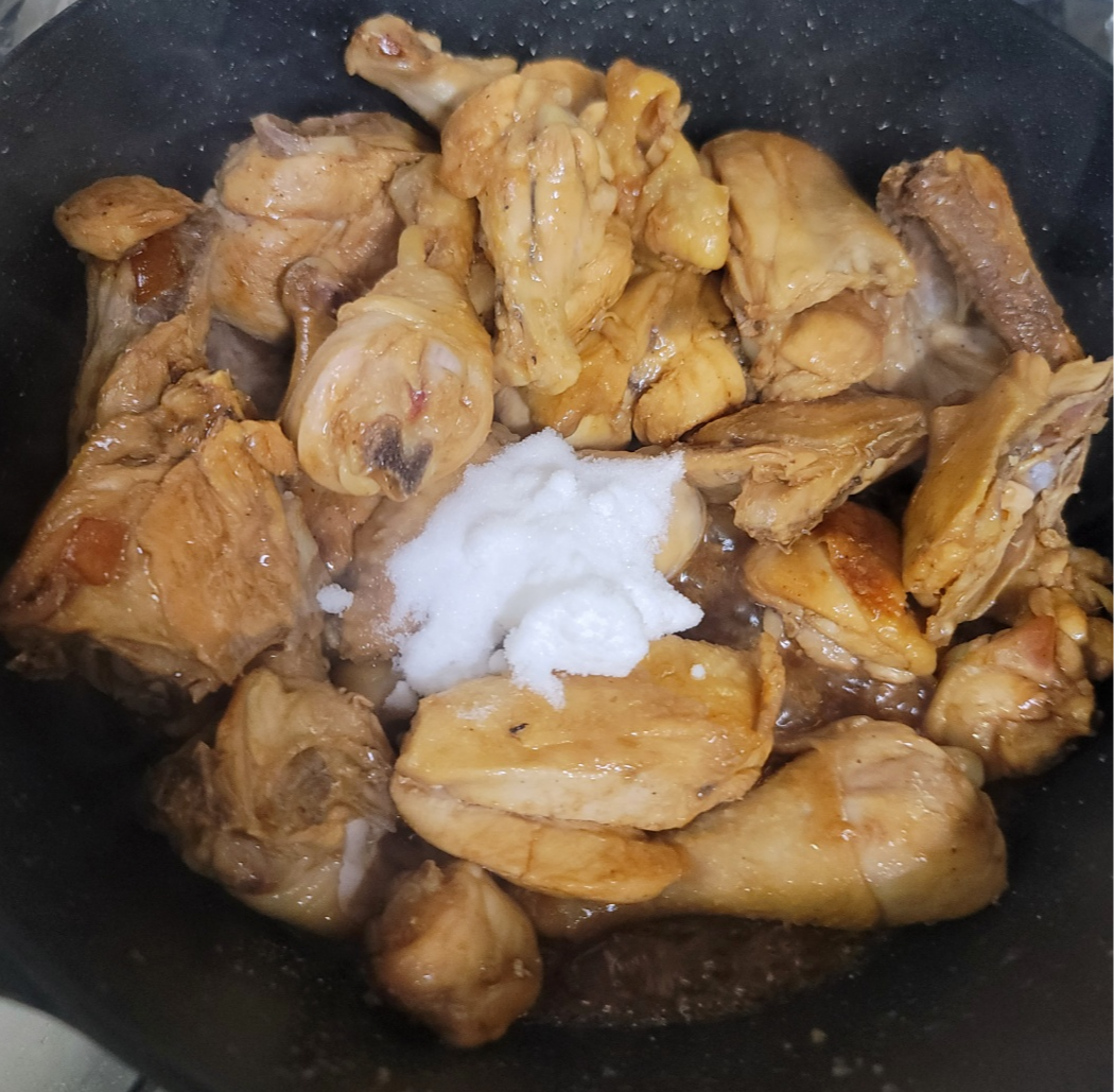 간장과 마늘이 끓어 닭 색깔이 갈색으로 변하면 설탕 4T, 굴소스 3T를 넣어줍니다.