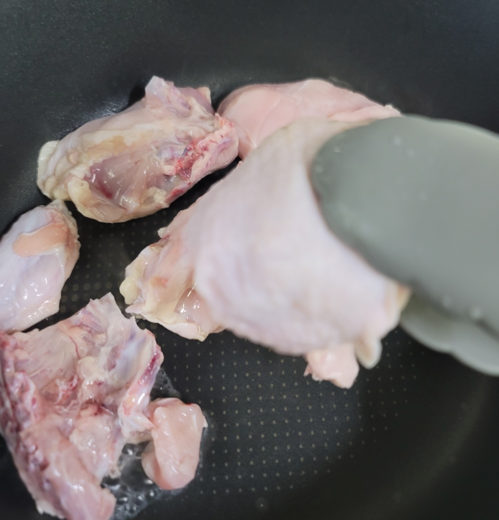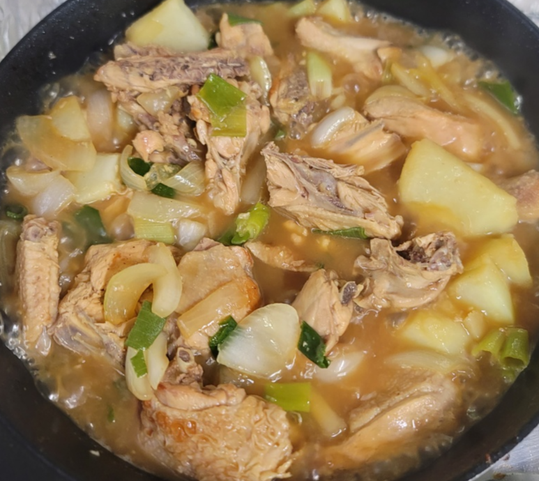 이대로 먹어도 맛있겠지만 당면을 위해 물을 넣어줍니다. 물은 닭고기가 위로 빼꼼할 정도로만 넣어주세요. 손질해 둔 대파, 양파, 감자를 넣어줍니다. 뚜껑을 닫고 강불로 6분 끓여줍니다.