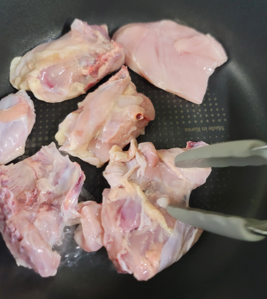 팬이 작아서 한 마리씩 구워야 해서 노릇하게 익은 닭을 건져주고 생닭인 한 마리를 똑같이 구워줍니다.