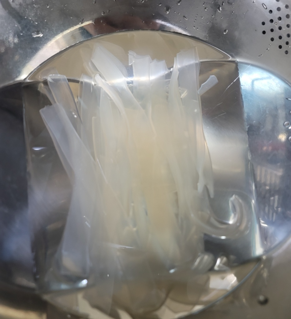 준비한 당면을 뜨거운 물에 담가놓으세요. 찜닭에 그냥 넣게 되면 끓이는 시간이 길어져 국물이 많이 없어집니다. 그래서 먼저 당면을 불려놓습니다.