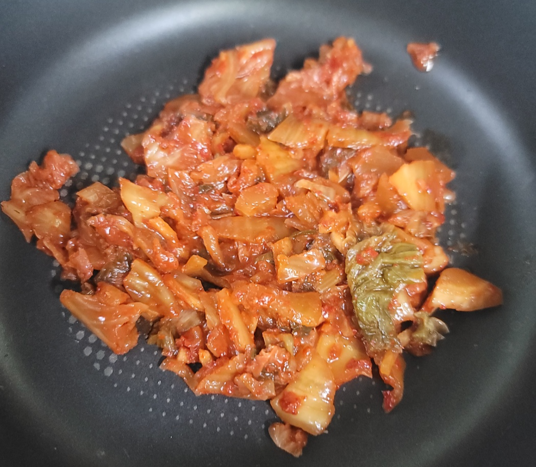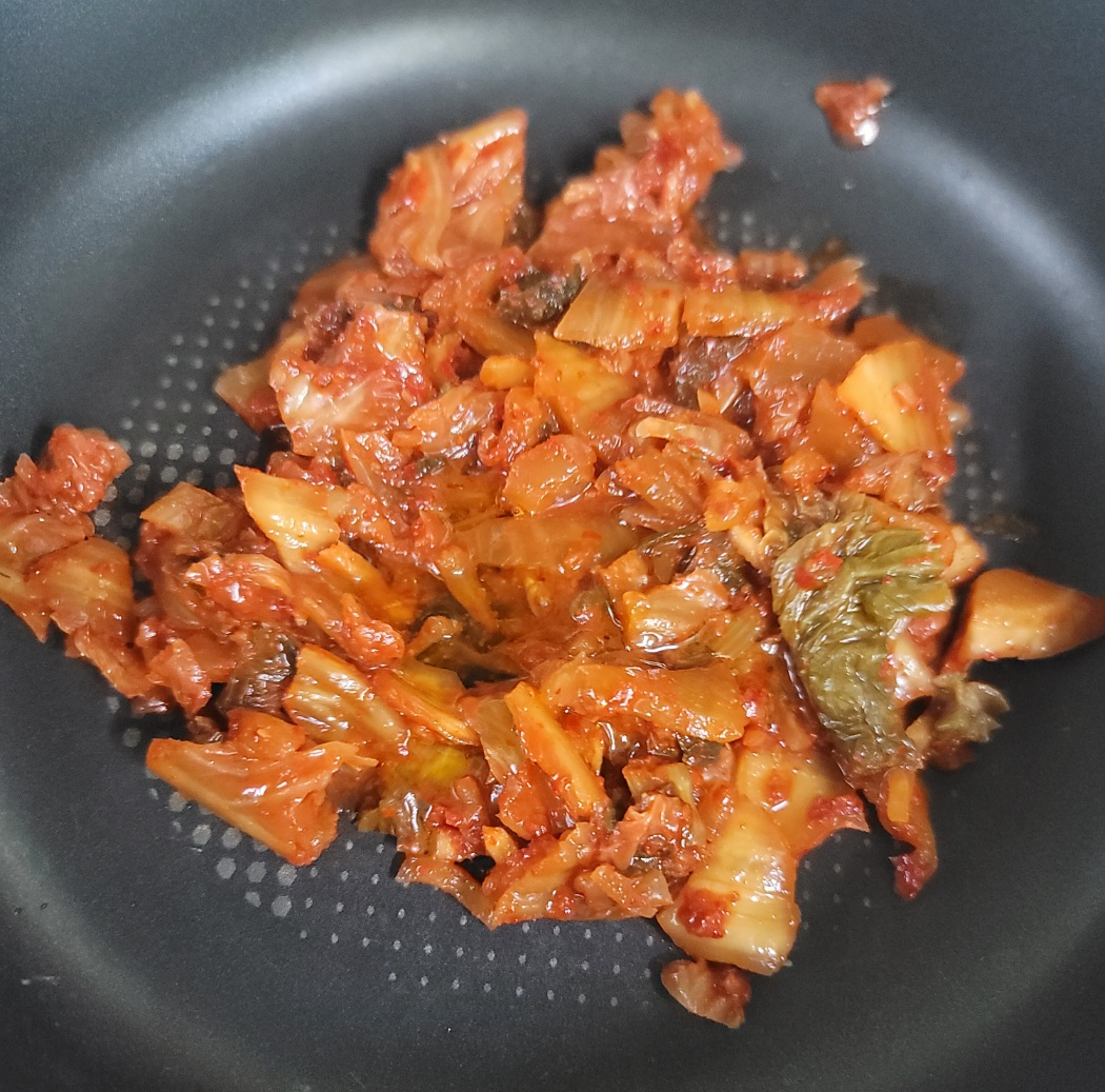 달걀 2개, 배추김치 한주먹, 참치 85g 작은 캔, 밥 한 공기, 간장 0.5T, 설탕 0.5T, 참치액 0.5T, 들기름 2T