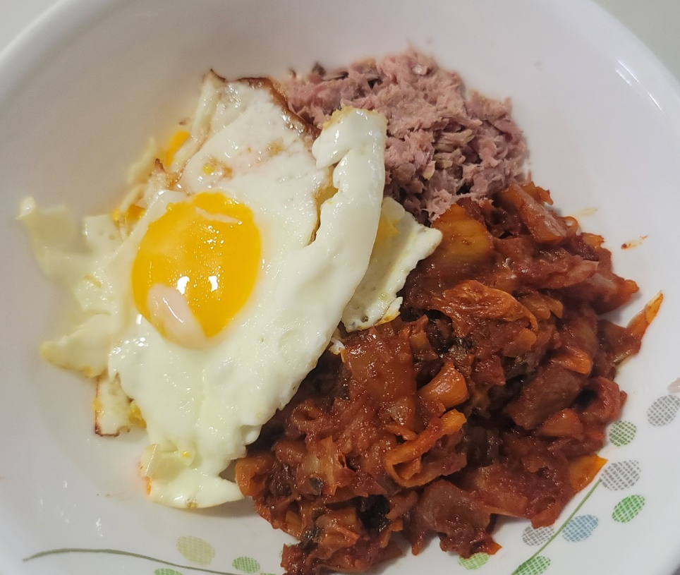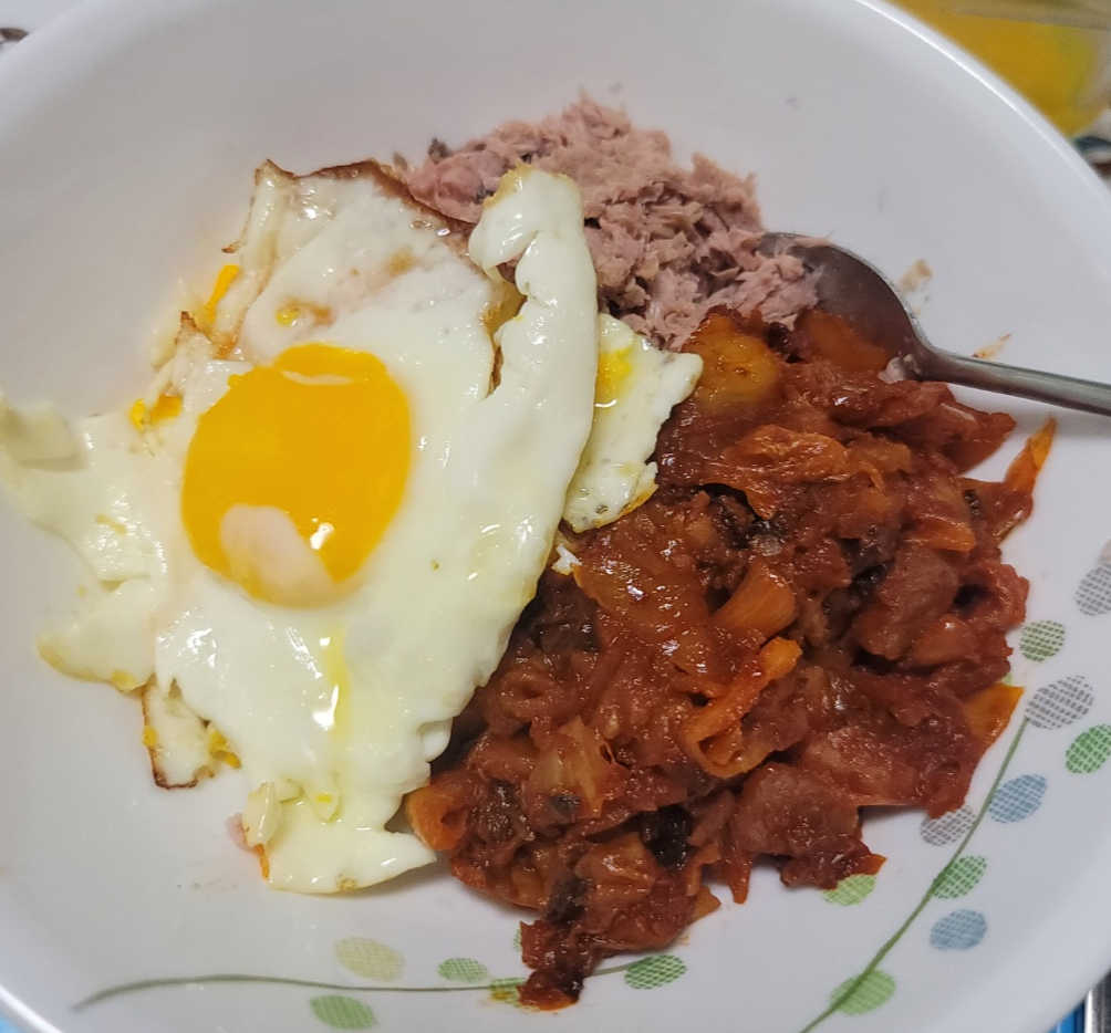 완성입니다!! 초간단 참치김치볶음밥~ 저는 밥을 같이 볶는 것보다 밥 위에 재료들을 올려서 비벼 먹는 게 더 좋더라고요. 참치김치볶음덮밥이라고 해야 하나요.