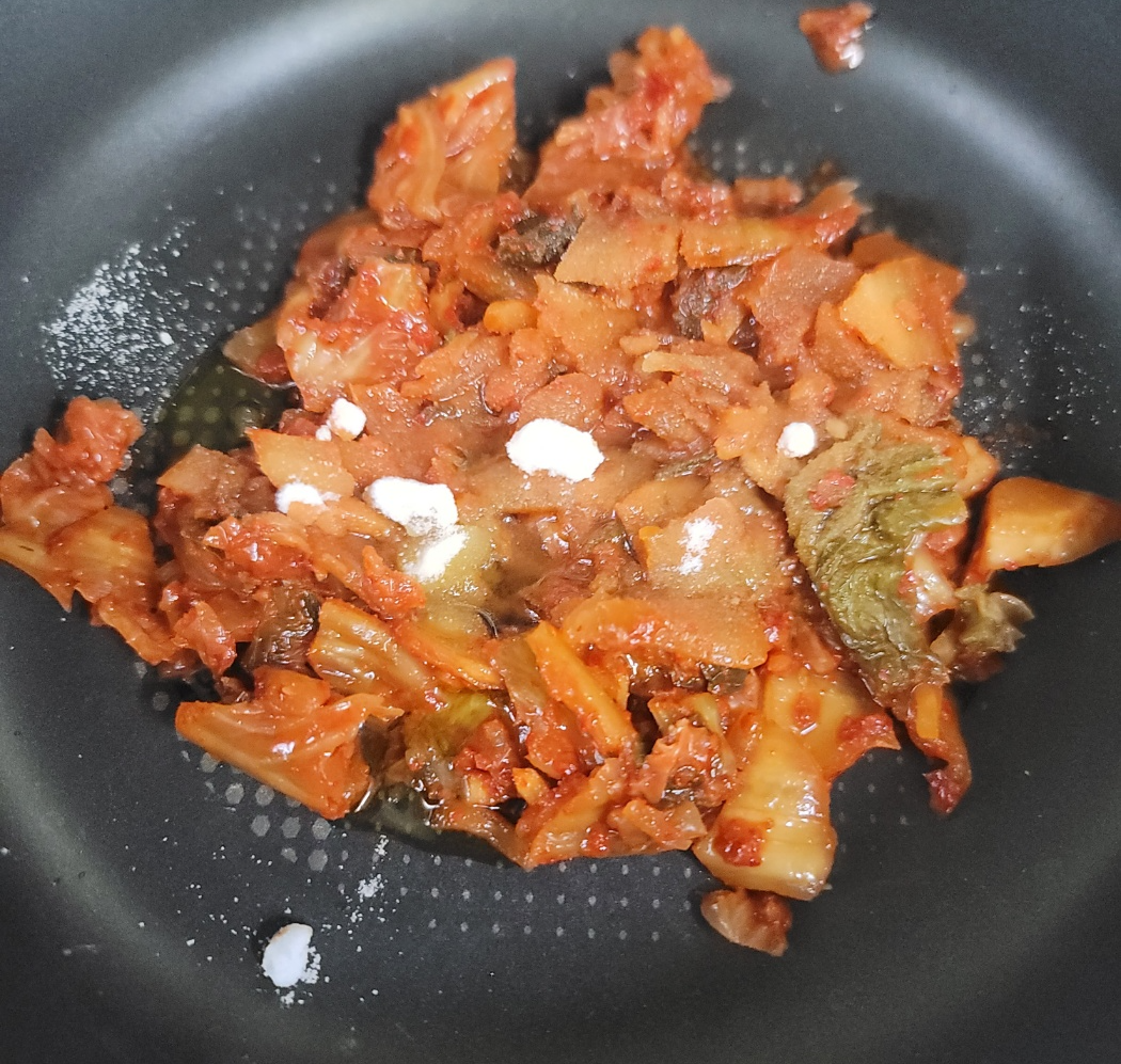 김치를 볶아줄건데요. 식용유 대신 들기름을 이용해 줍니다. 들기름 2T를 넣고 간장 0.5T, 설탕 0.5T을 넣어줍니다. 감칠맛을 위해 참치액 0.5T를 넣어줍니다. 넣고 안 넣고 차이가 커요~
