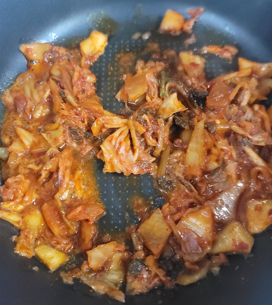 타지 않게 열심히 볶아줍니다. 저는 살짝 태운 것도 좋아하는데 건강에 좋진 않으니까요~ 김치가 들기름을 먹어 윤기가 좔좔 흐르네요. 김치볶음은 벌써 끝이에요.