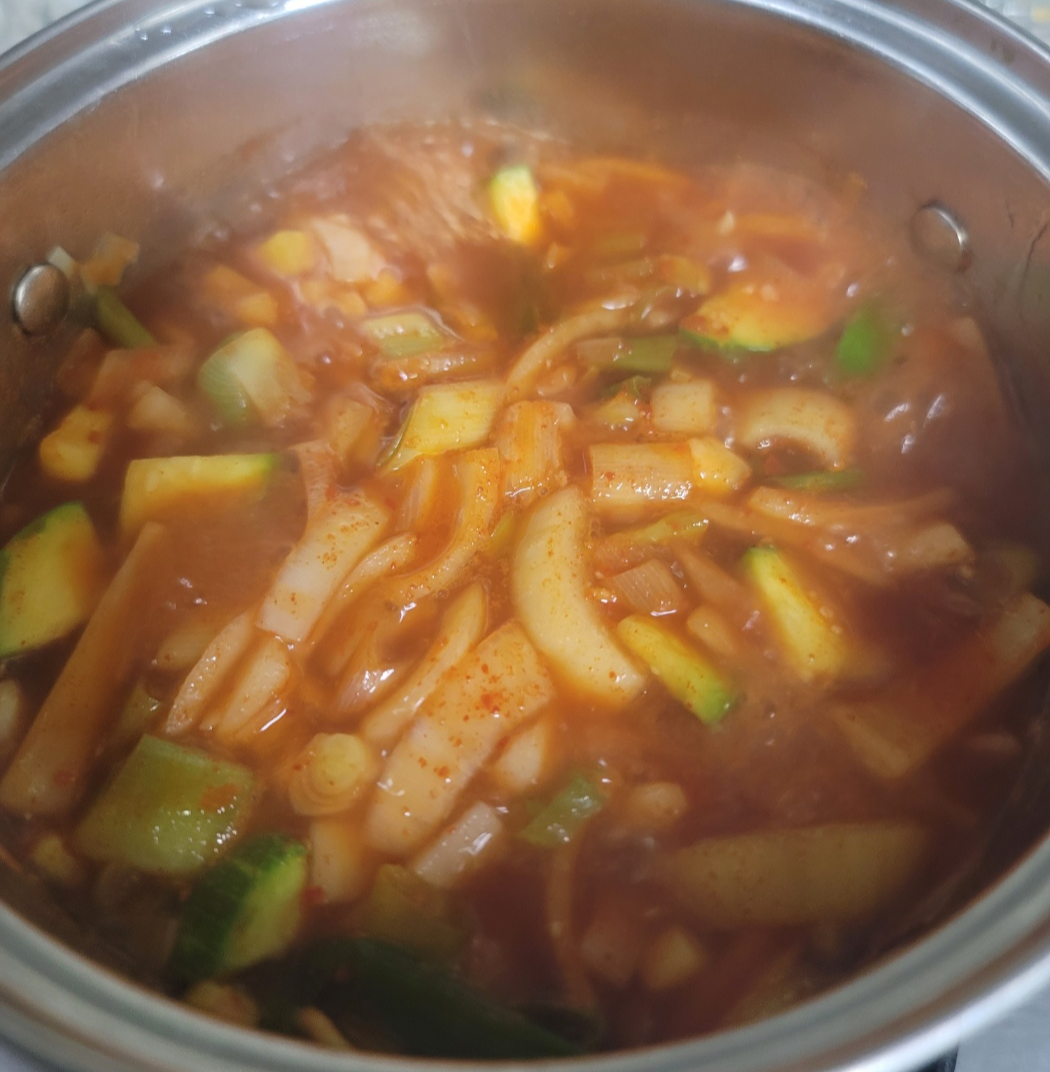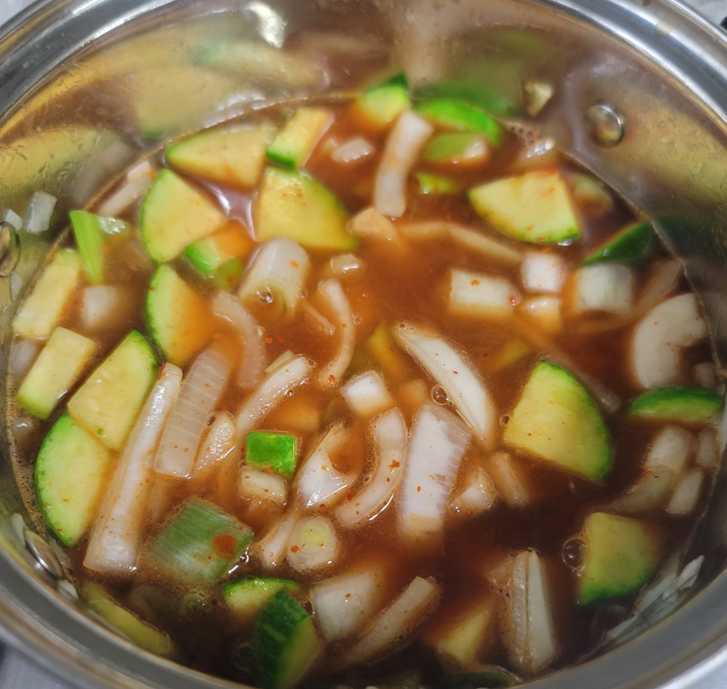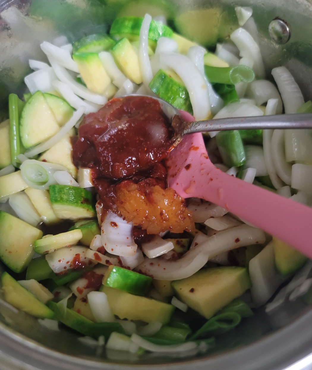 야채들과 양념장을 넣고 물을 야채들이 잠길정도로 넣어주고 야채들이 익는 시간이 필요하기 때문에 먼저 끓여줍니다.