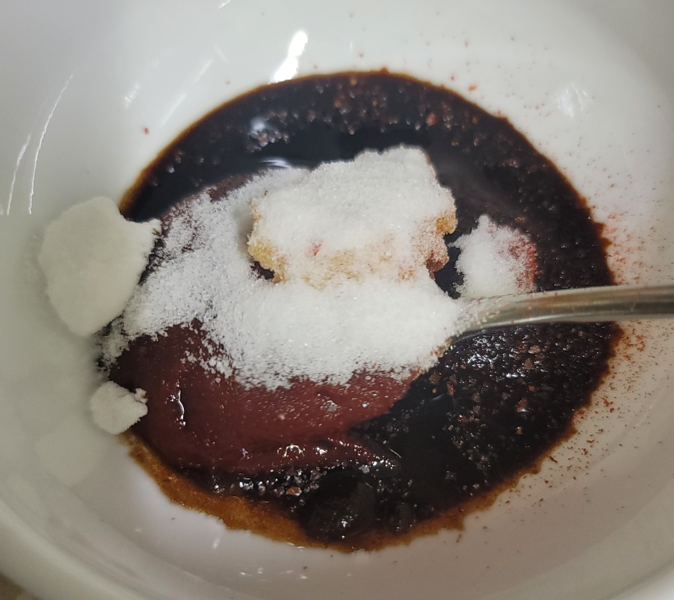 고추장 1T를 수북하게 떠줍니다. 간장 1T랑 고추가루 1T, 설탕 0.5T, 다진마늘 1.5T도 함께 넣어줍니다. 감칠맛을 위해 참치액도 1t를 넣어줍니다.
