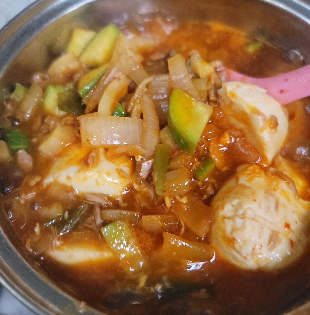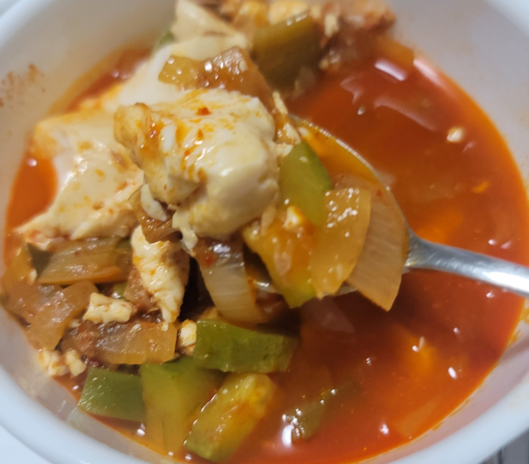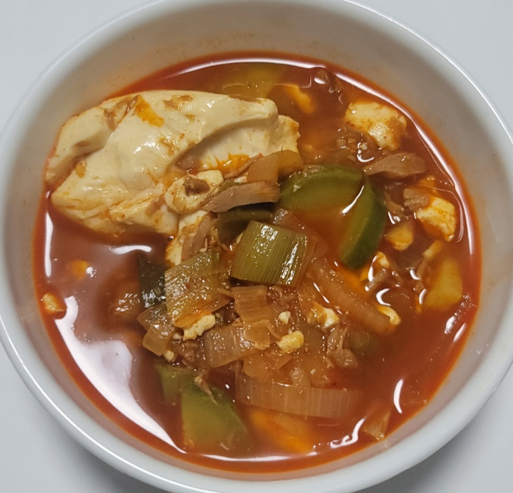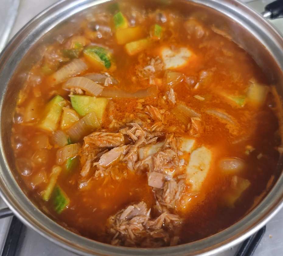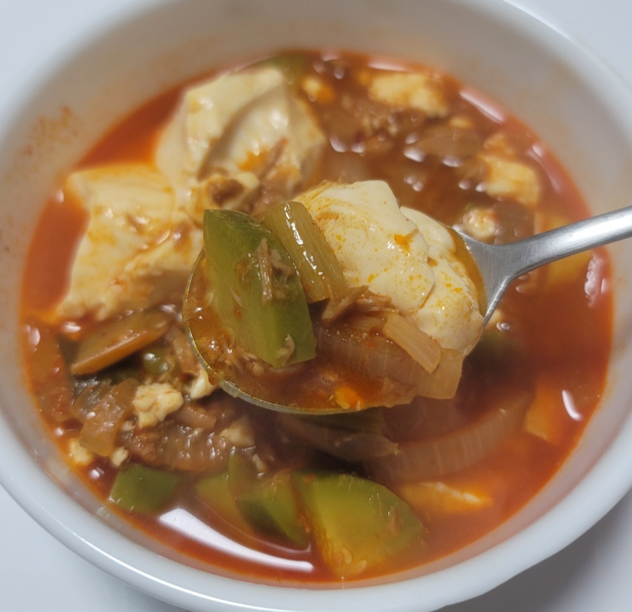 파 1대, 애호박 2/3개, 양파 1개, 참치 100g, 순두부 1개, 고추장 수북하게1T, 간장 1T, 설탕 0.5T, 다진마늘 0.5T, 고춧가루 1T, 참치액 1t (밥숟가락 기준, 참치액만 티스푼 기준)