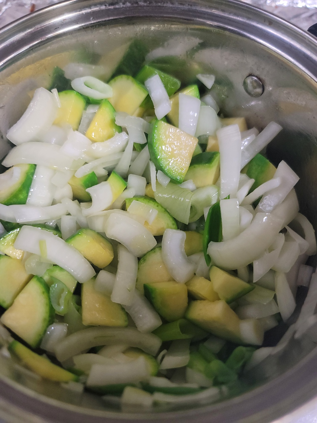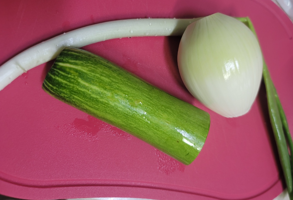 애호박 2/3개랑 양파 1개, 대파 1대를 깔끔하게 손질해줍니다. 대파는 쫑쫑 썰어주시고 애호박은 1/4 크기로 한 입크기로 양파도 애호박과 비슷한 크기로 썰어줍니다.