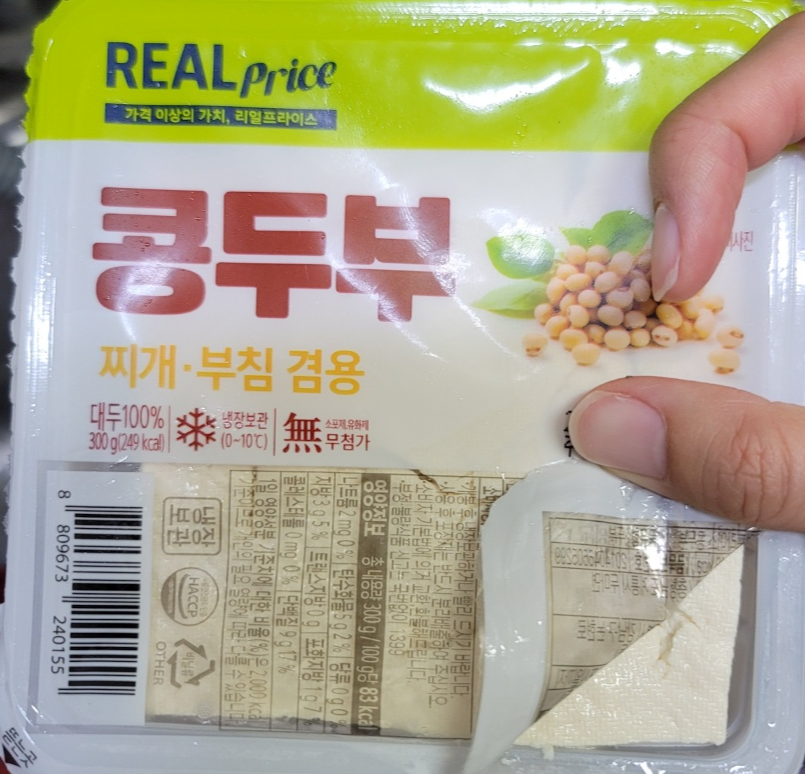 두부 포장을 조금만 뜯어서 꾹꾹 눌러서 최대한 물을 빼줍니다.