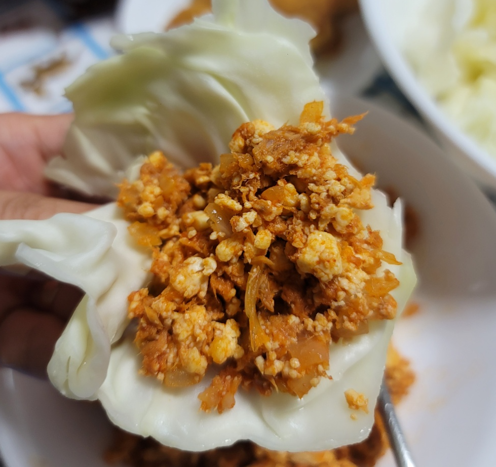 양배추 위에 얹어서 한입 먹었는데 계속 들어가네요. 칼로리도 낮아서 부담 없이 먹을 수 있습니다. 다이어트하는 동안 자주 해 먹을 것 같아요. 두부참치쌈장 최고!