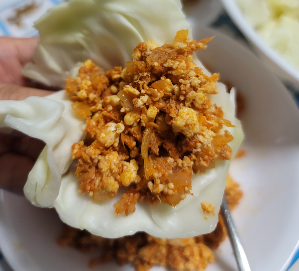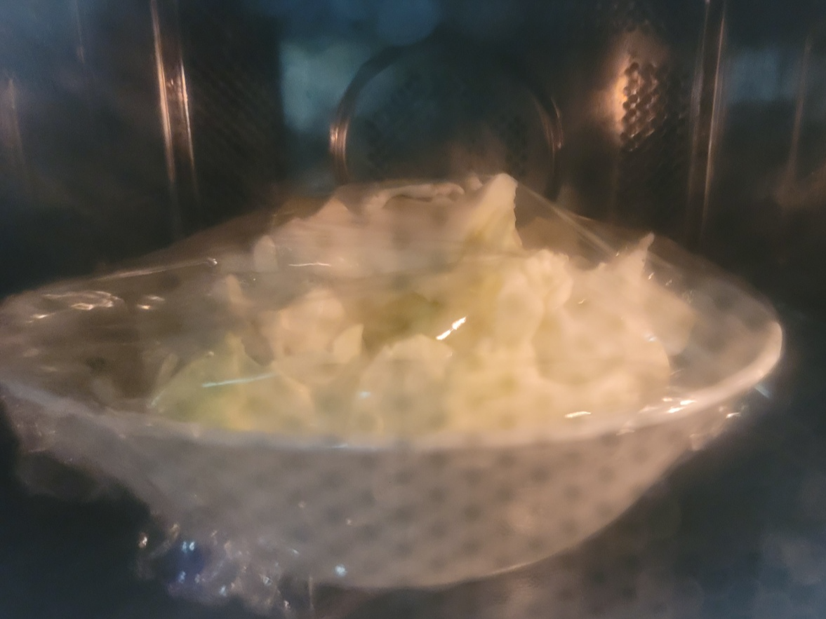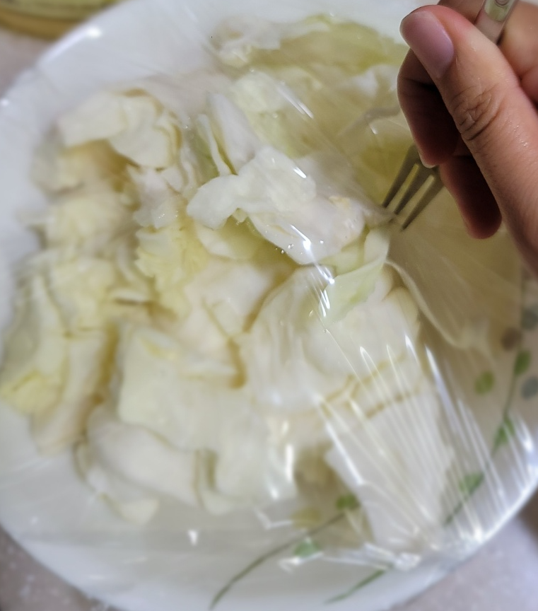 엄청 뜨거우니 조심하세요. 아삭함이 살아있는 양배추 찜이 완성되었습니다.