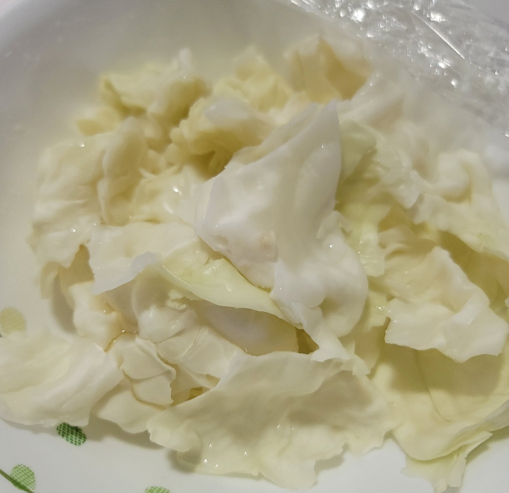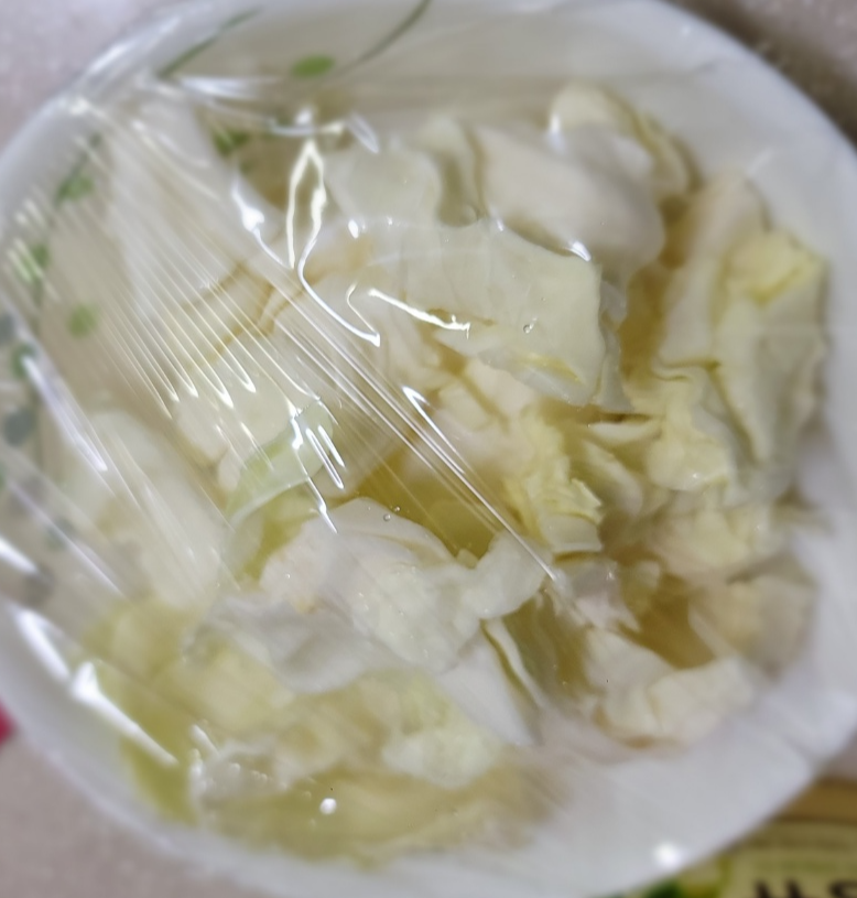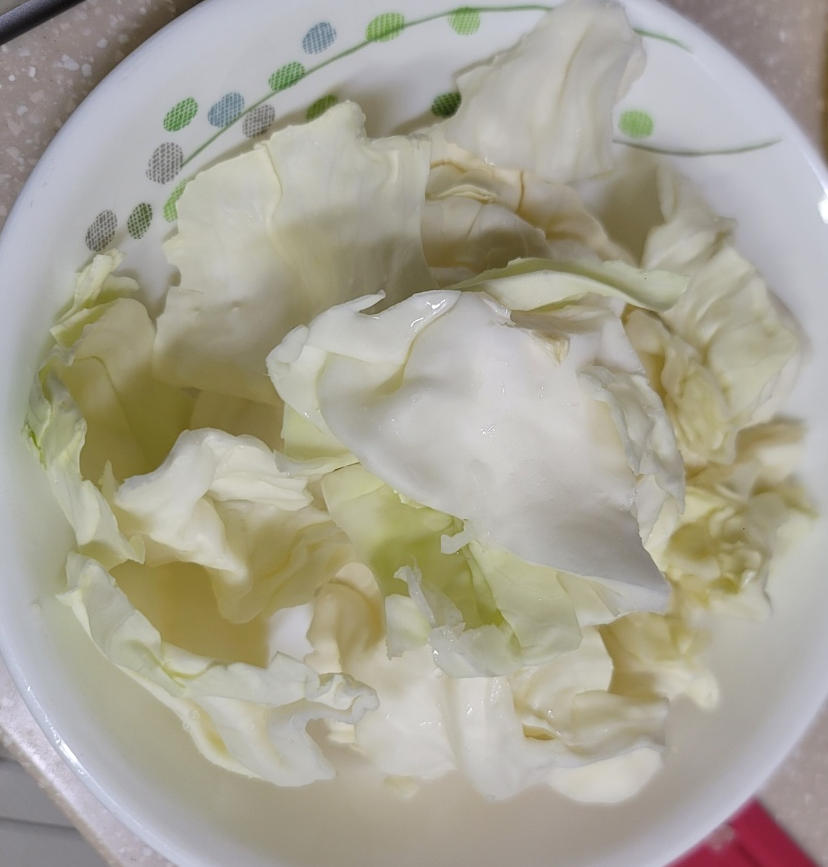 양배추를 먹을 만큼 한 겹 씩 뜯어 씻어줍니다. 양배추를 전자레인지에 찌려면 물이 조금 필요해서 물기를 많이 털지는 않습니다.