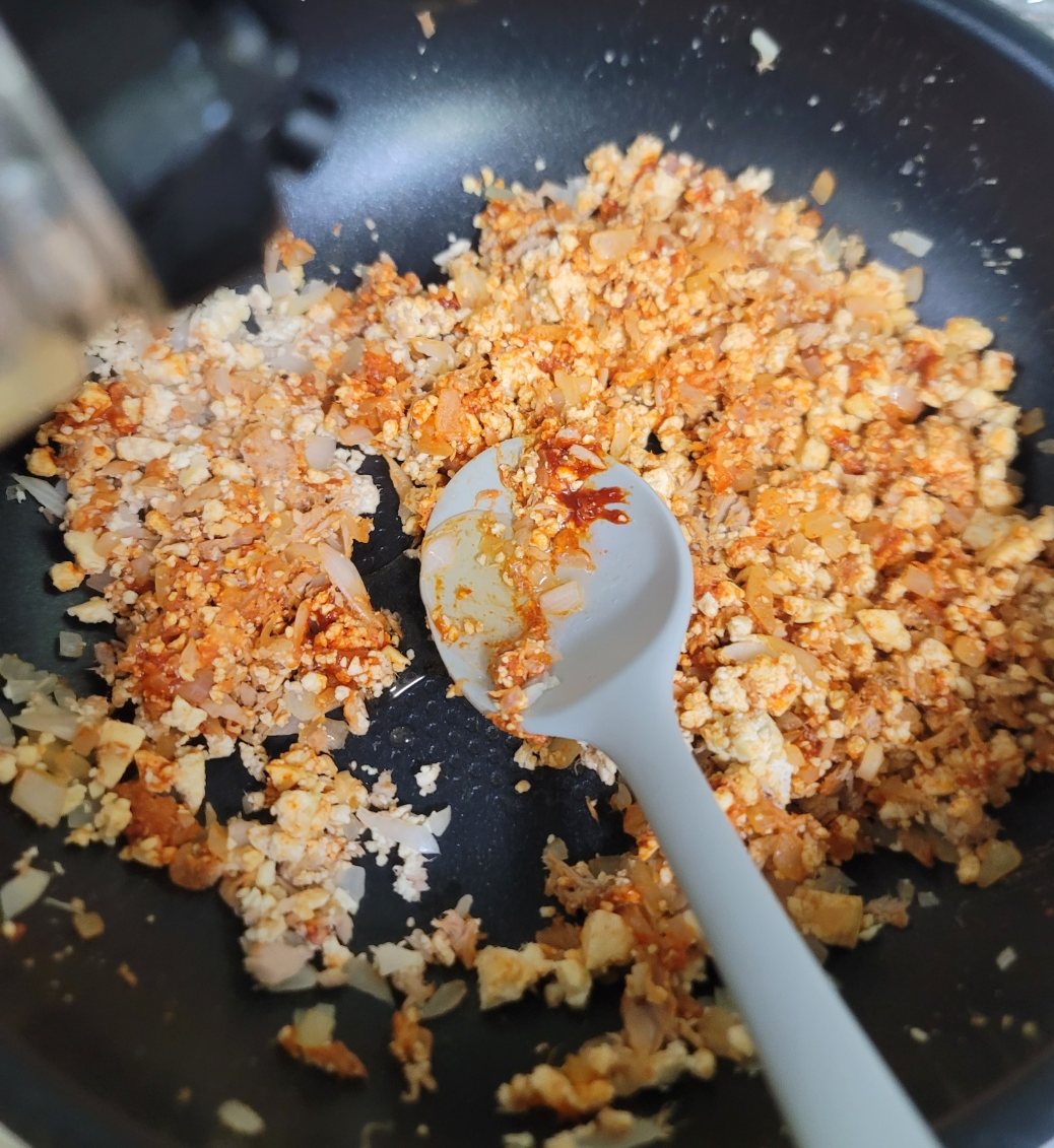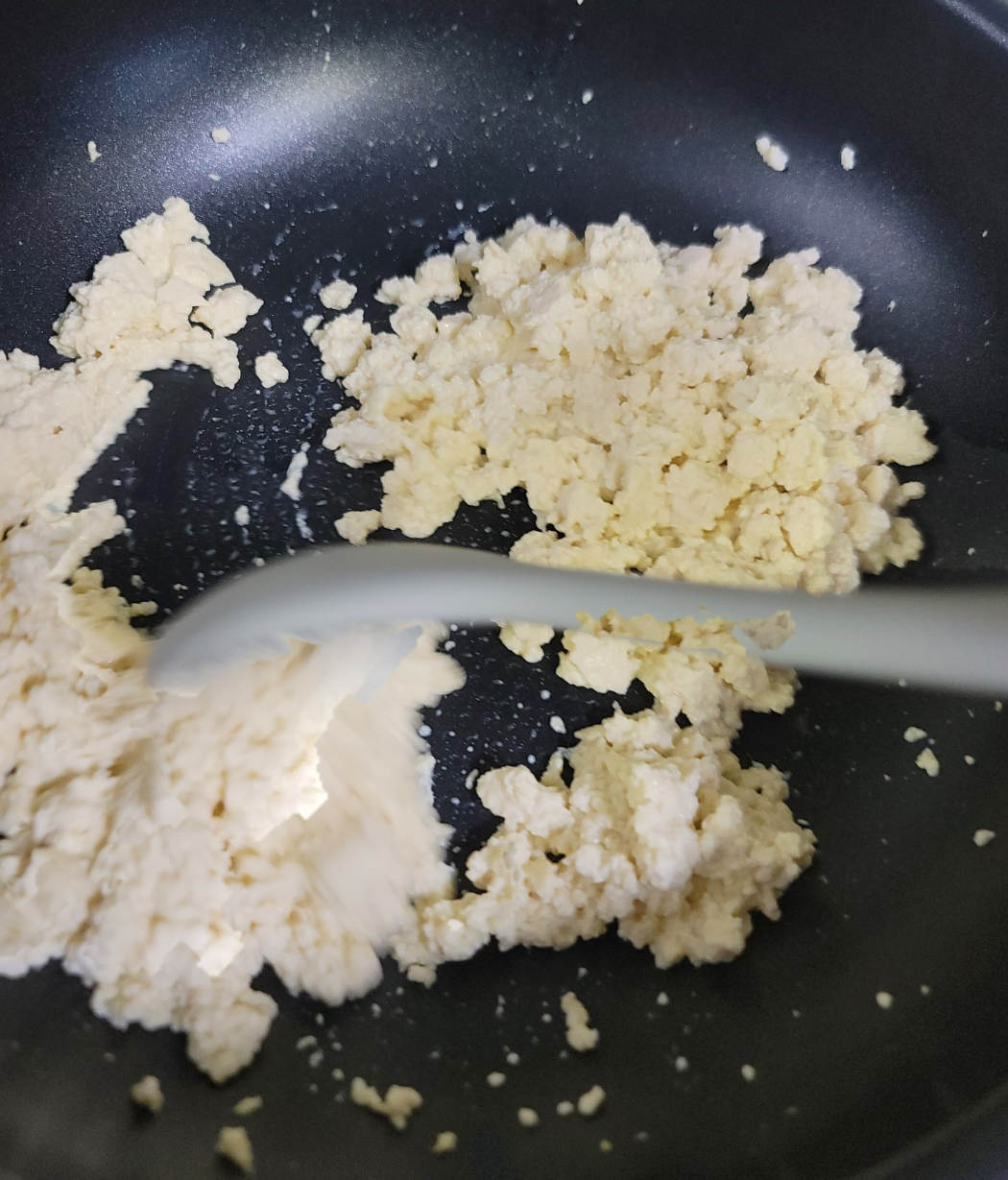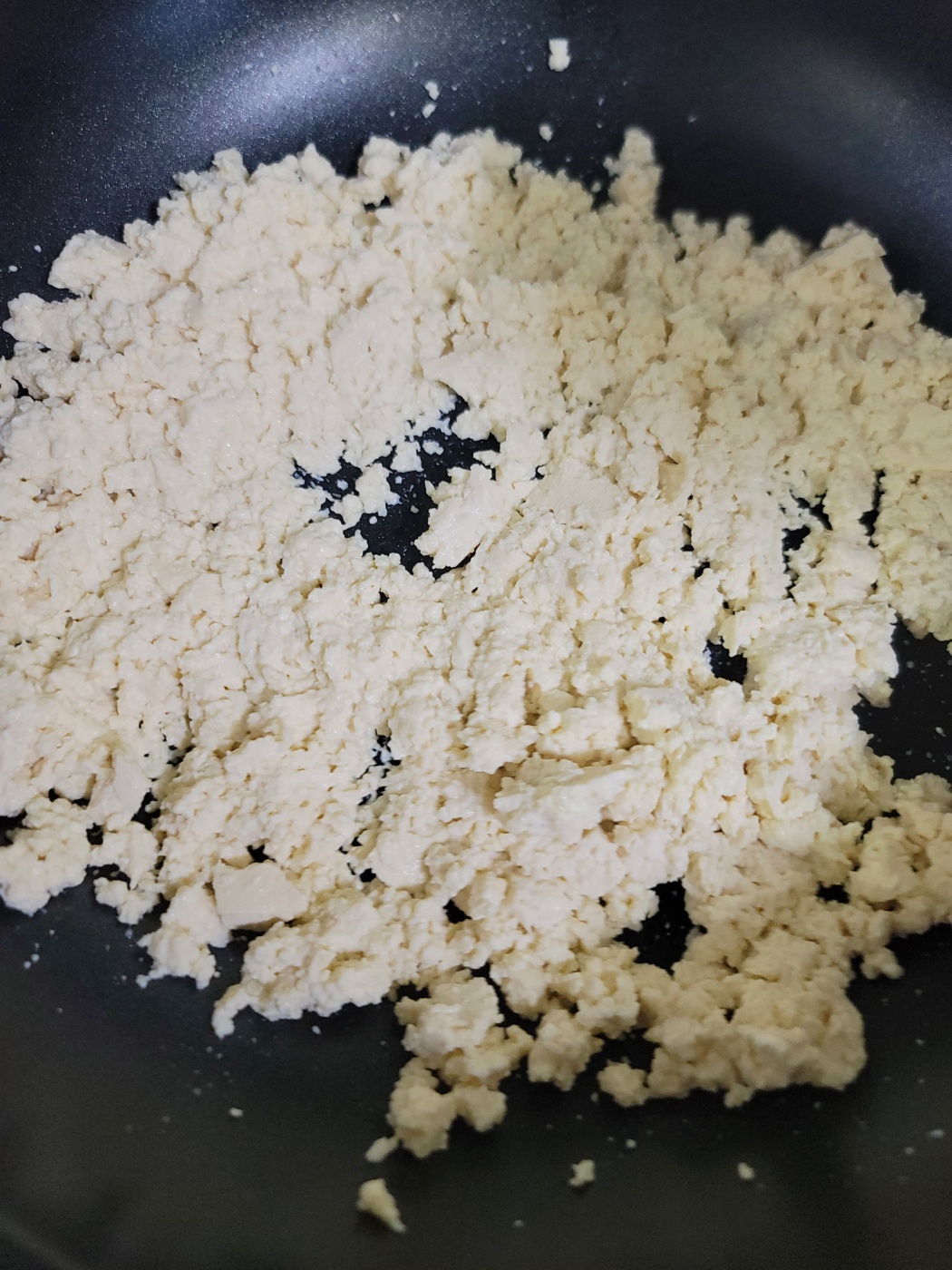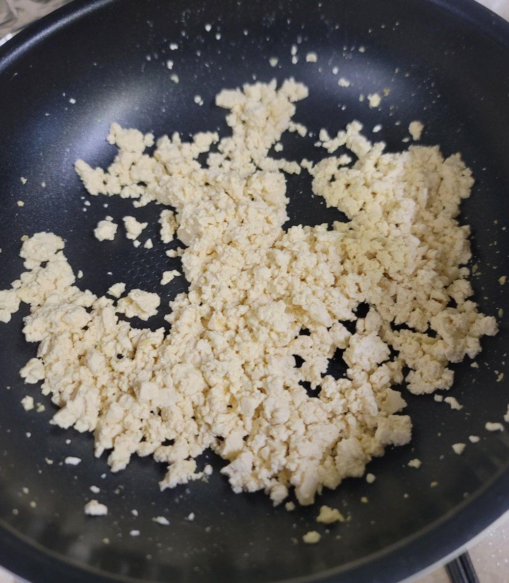 중불로 기름을 두르지 않고 마른 팬에 으깬 두부를 볶아줍니다. 두부에 남은 수분을 쪽 빼주듯이 볶아줍니다.