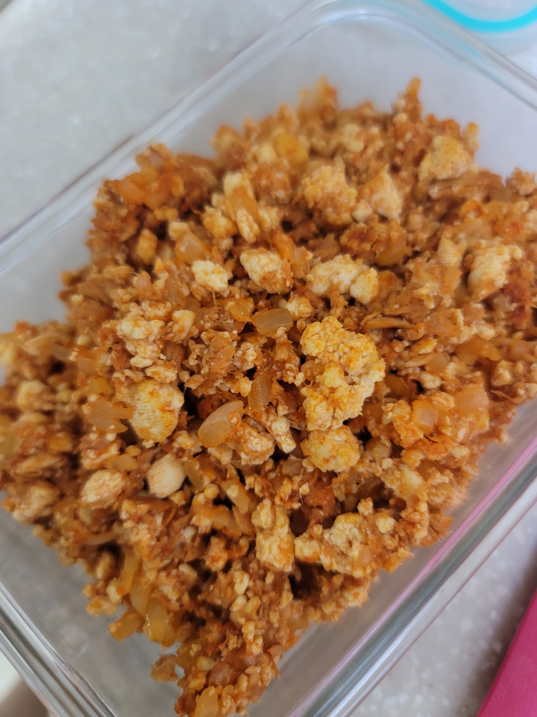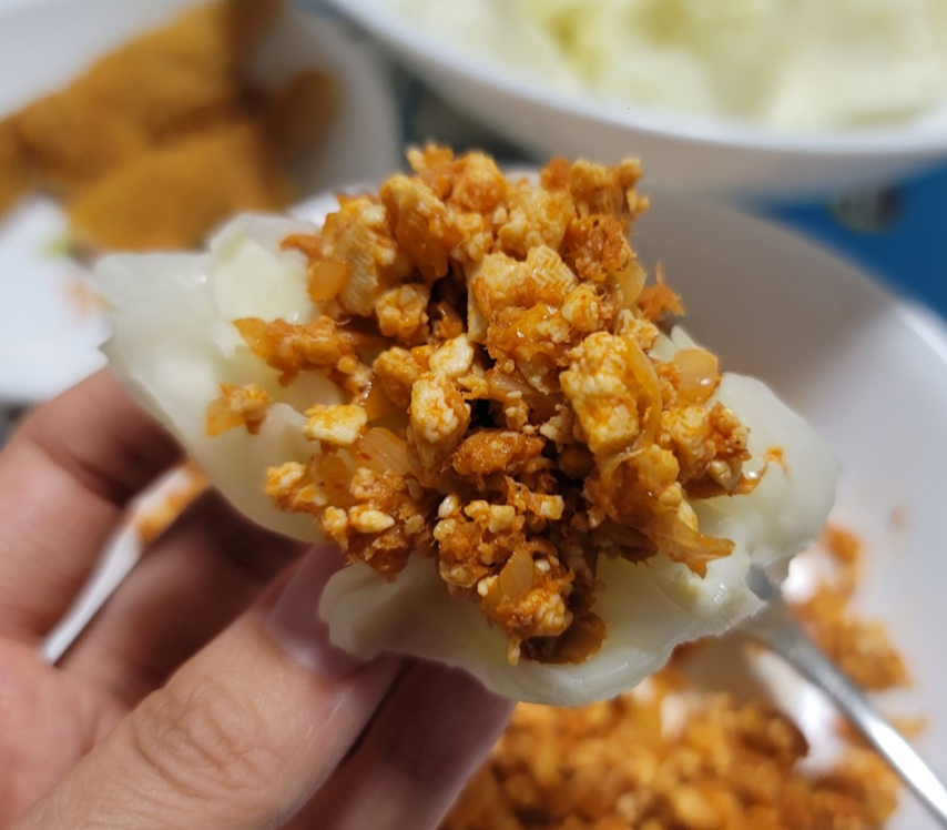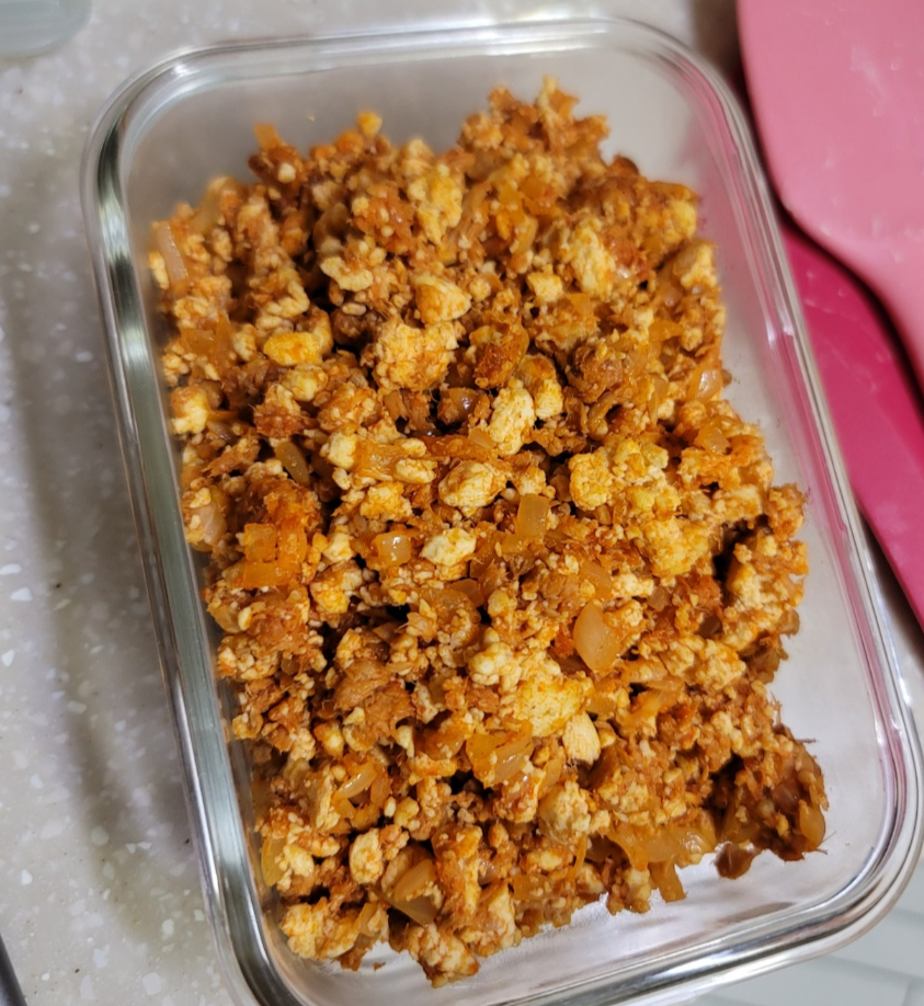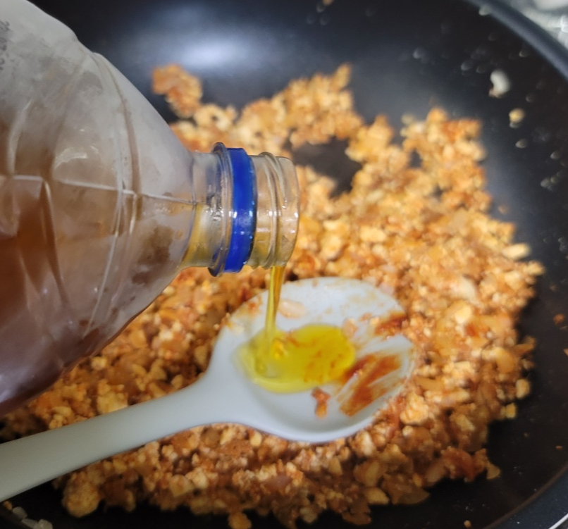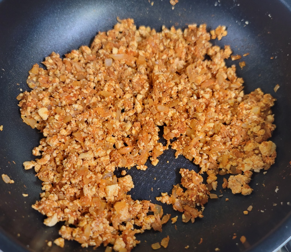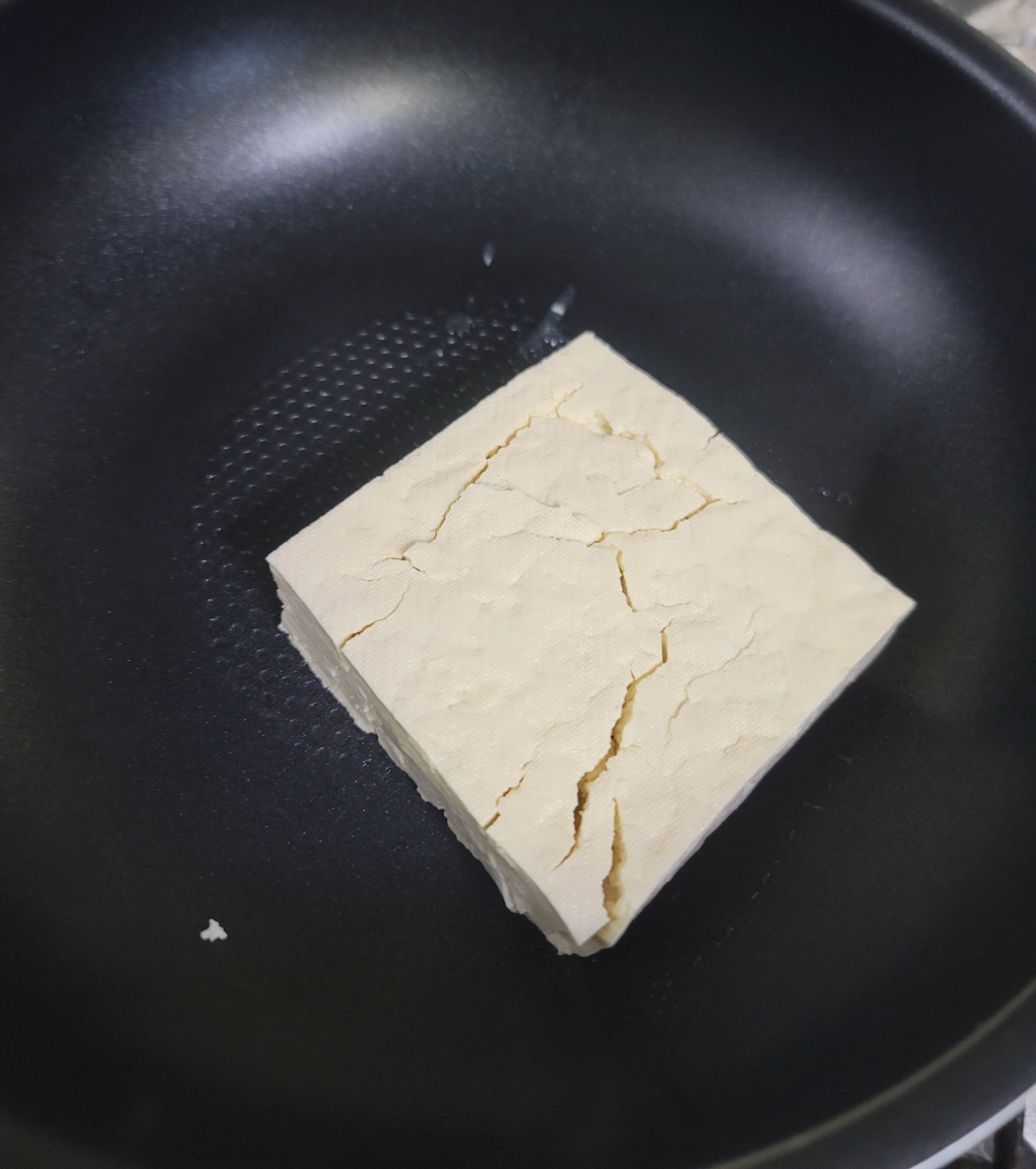 중불로 기름을 두르지 않고 마른 팬에 으깬 두부를 볶아줍니다. 두부에 남은 수분을 쪽 빼주듯이 볶아줍니다.