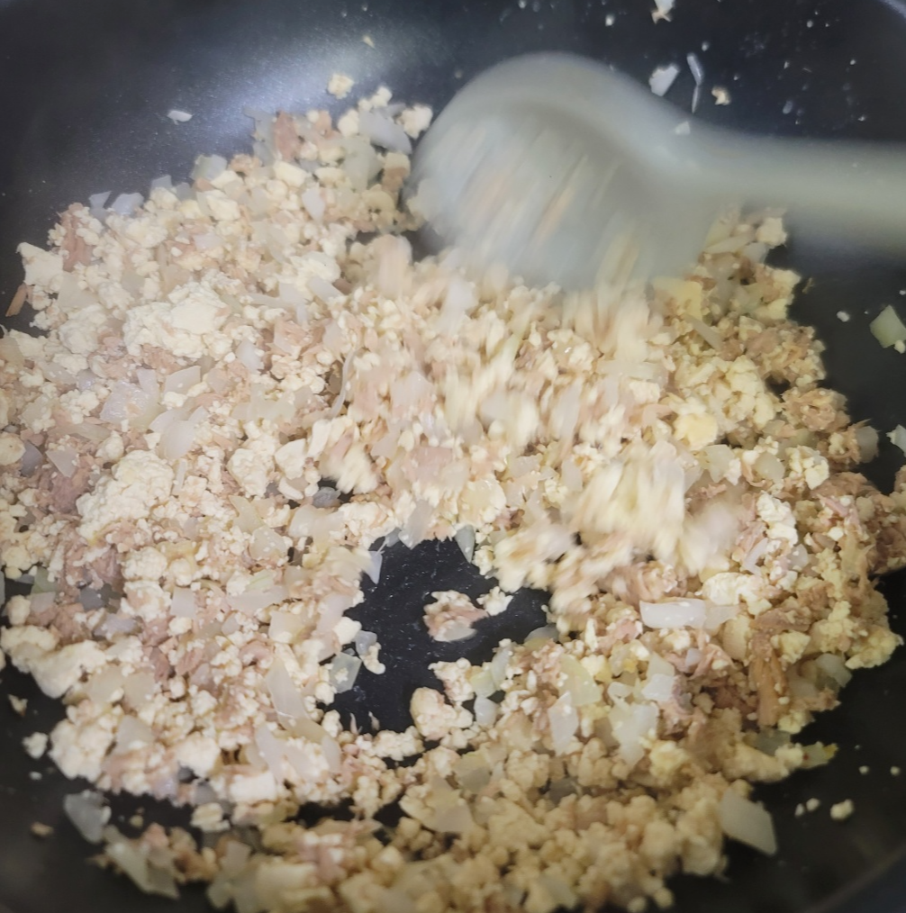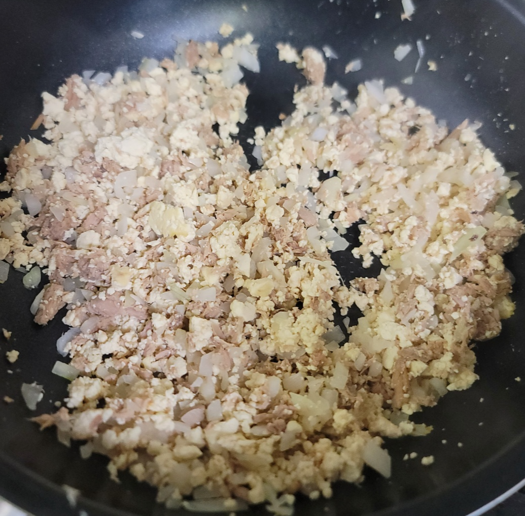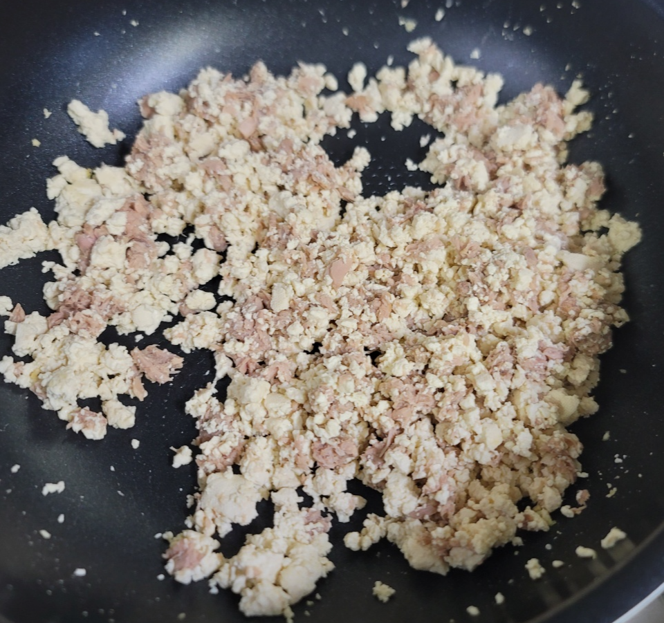수분이 날아간 두부에 기름 뺀 참치를 넣고 같이 볶아줍니다.