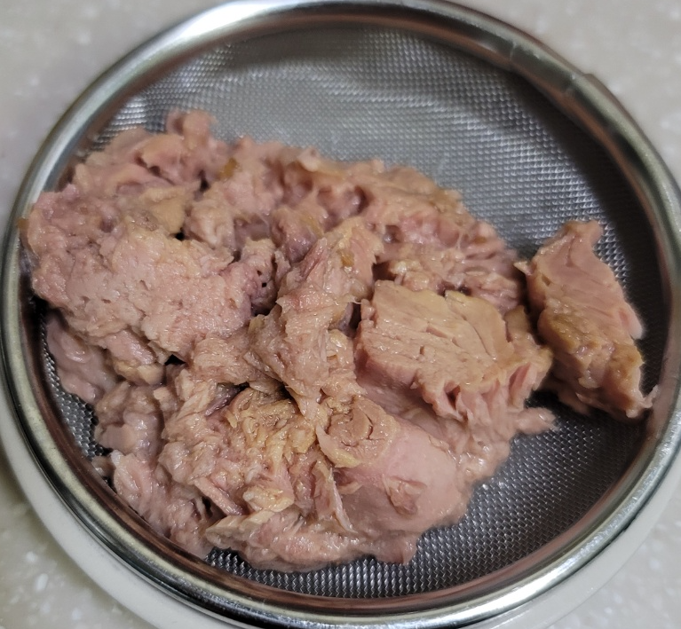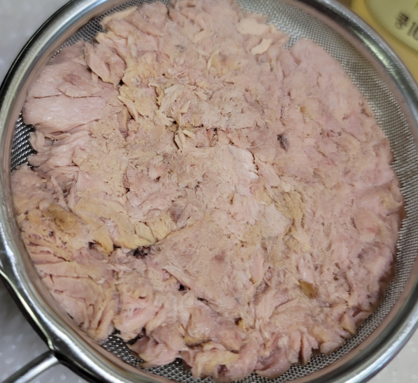 참치 1캔 100g짜리를 준비해 줍니다. 기름을 쪽 빼줍니다. 채에 넣고 숟가락으로 꾹꾹 눌러주면 기름이 많이 빠집니다.