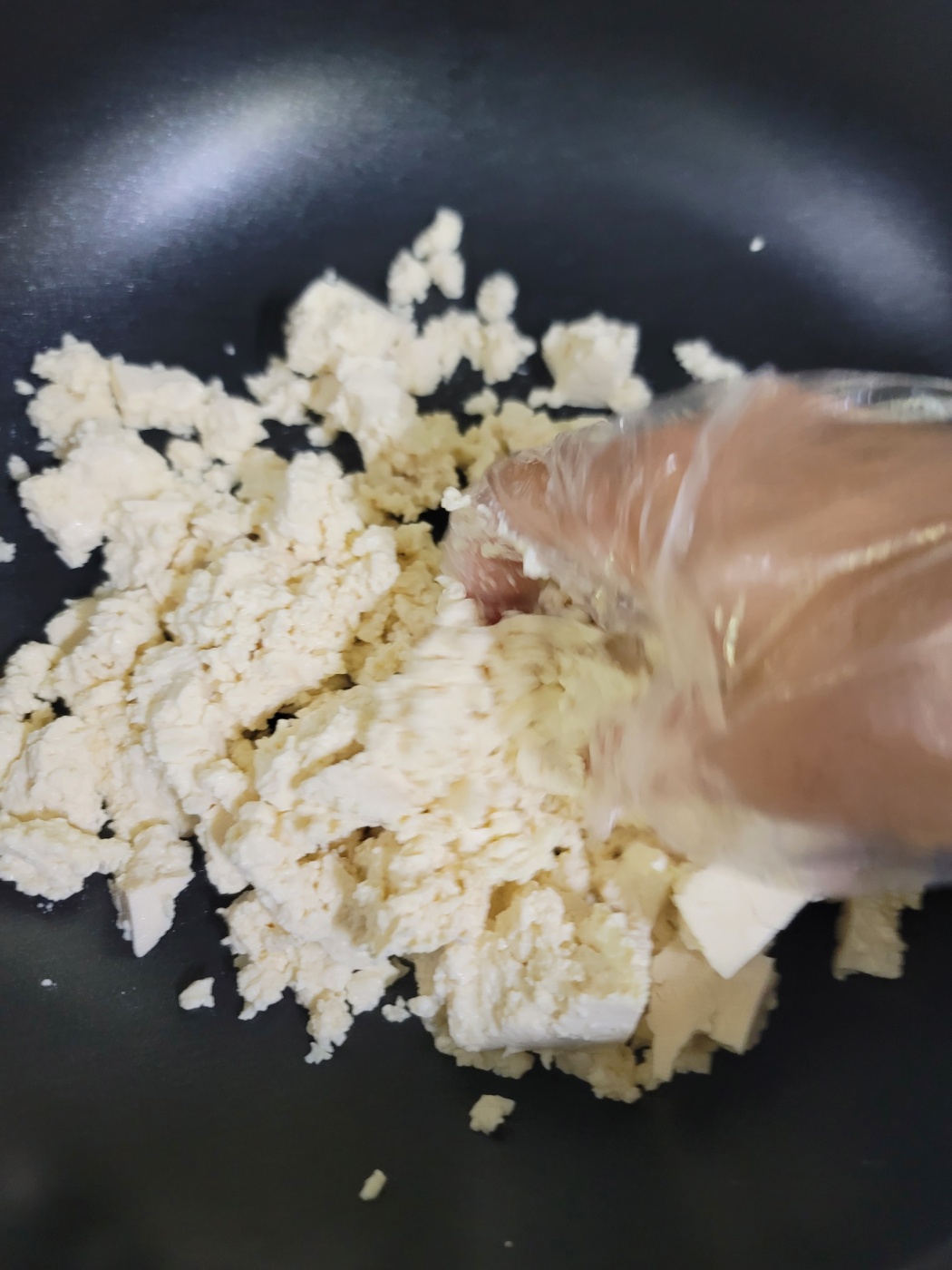 물을 뺀 두부를 팬 위에 올려줍니다. 손으로 최대한 작게 으깨줍니다.