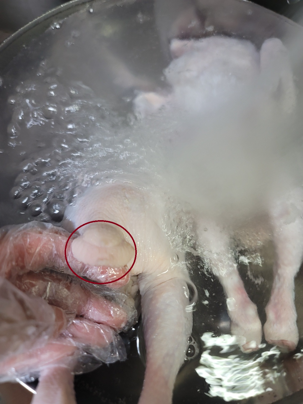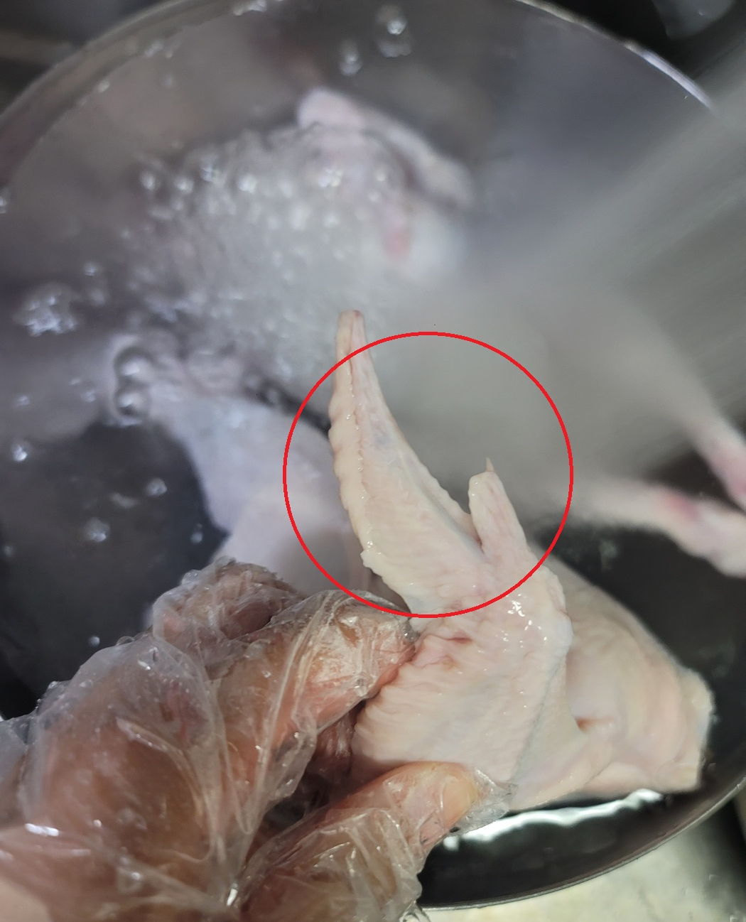 닭손질을 시작합니다. 흐르는 물에 닭을 먼저 닦아줍니다. 닭 엉덩이에 혹이 하나 보이는데요. 여기를 꼭 잘라주세요. 날개 부분에서도 뾰족한 부분을 잘라줍니다. 잘라줘야 잡내가 안 납니다.