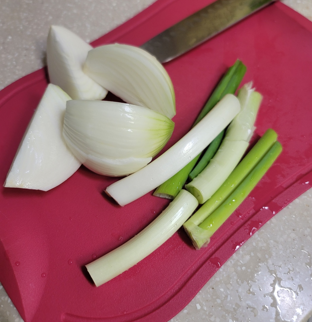재료가 정말 간단한데요. 양파 1개, 대파 1대가 필요합니다. 끓일때 같이 넣어줄 거라서 크게 숭덩숭덩 썰어줍니다.
