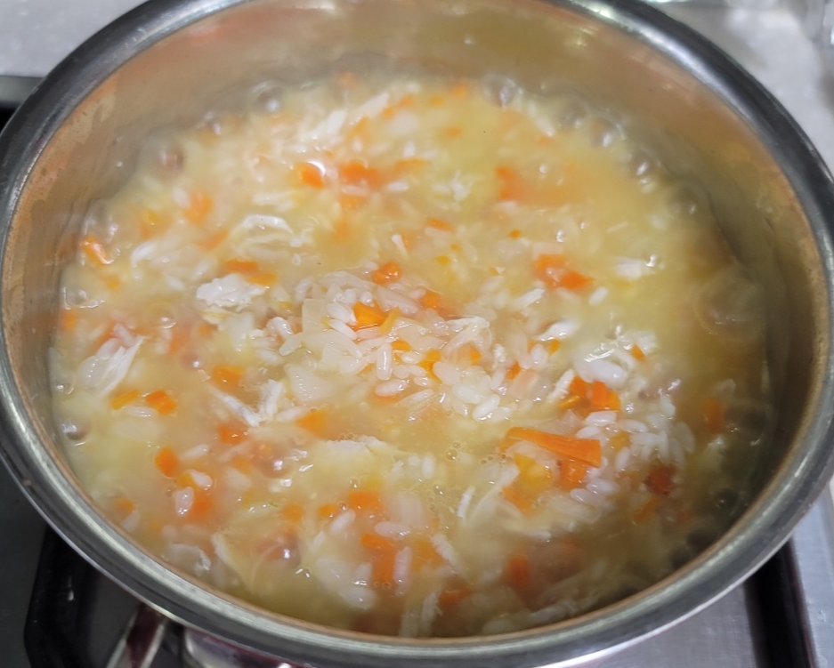 닭백숙 국물을 충분히 넣고 찢어둔 닭고기와 당근과 양파, 찹쌀까지 같이 넣어줍니다.