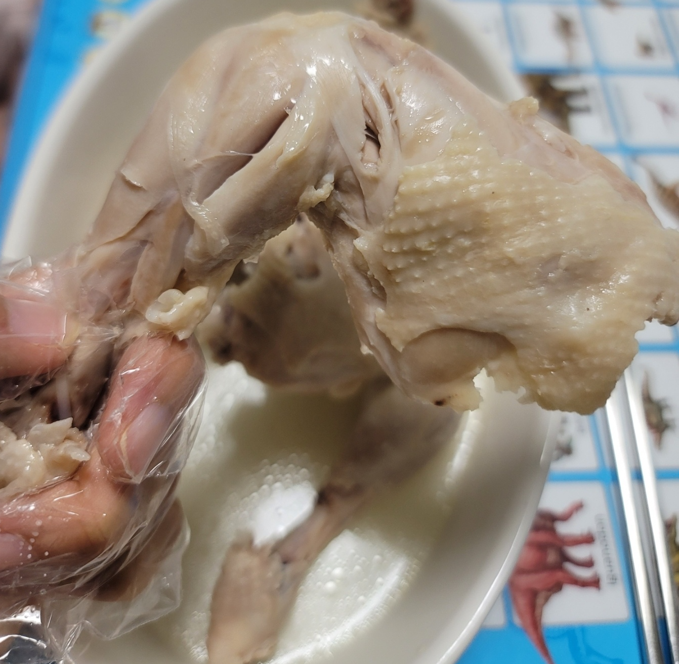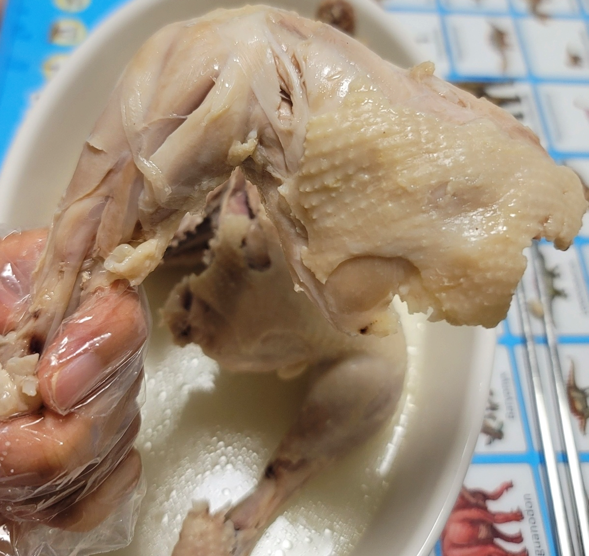중간에 닭을 뒤집느라고 등에 구멍이 뽕 났네요. 닭모양이 적나라하게 살아있는 닭백숙입니다.