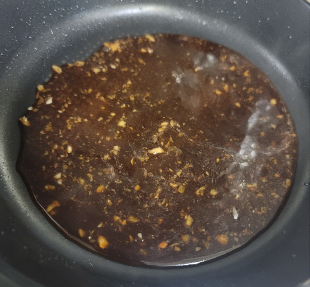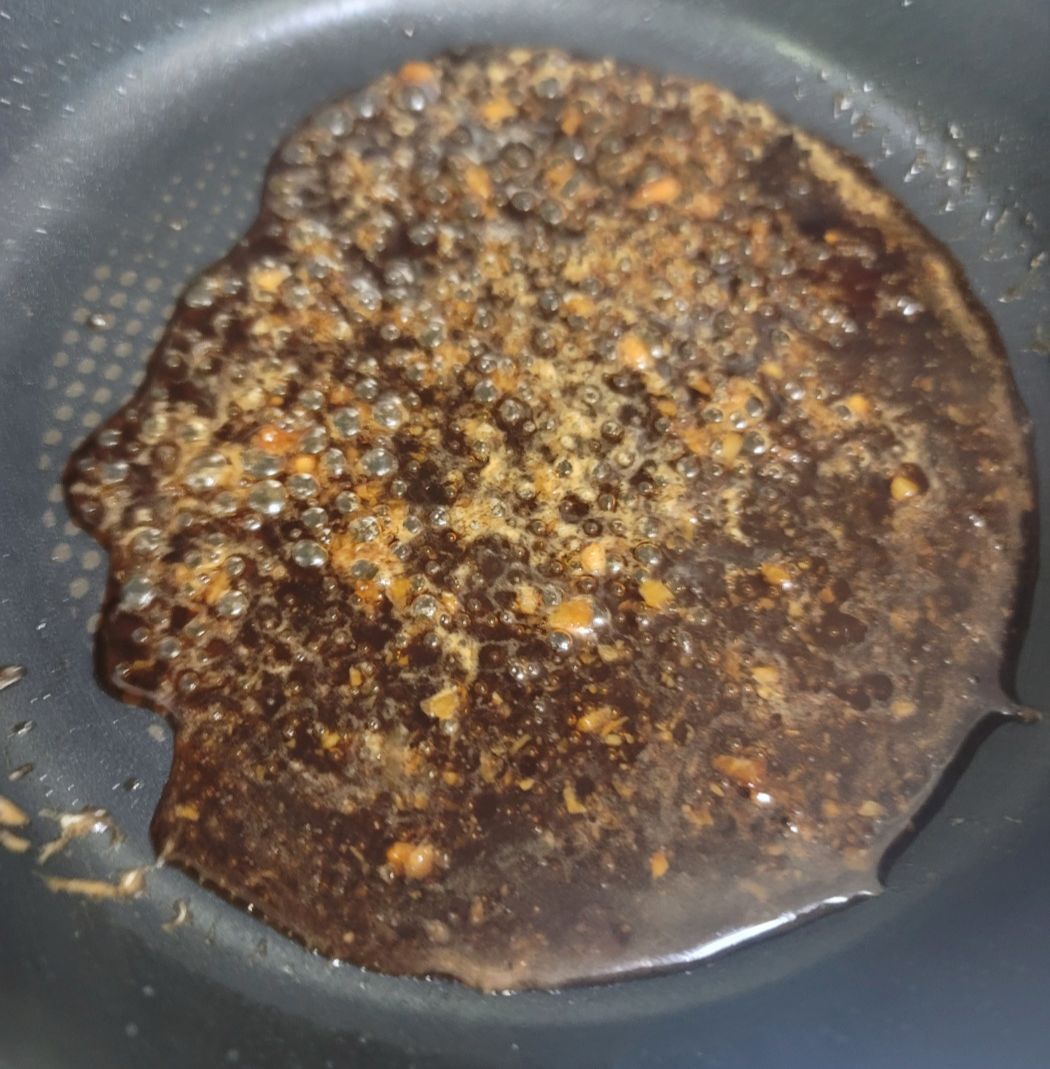 양념이 타지않게 약불로 맞춰주고 팬에 만든 양념을 부어줍니다.