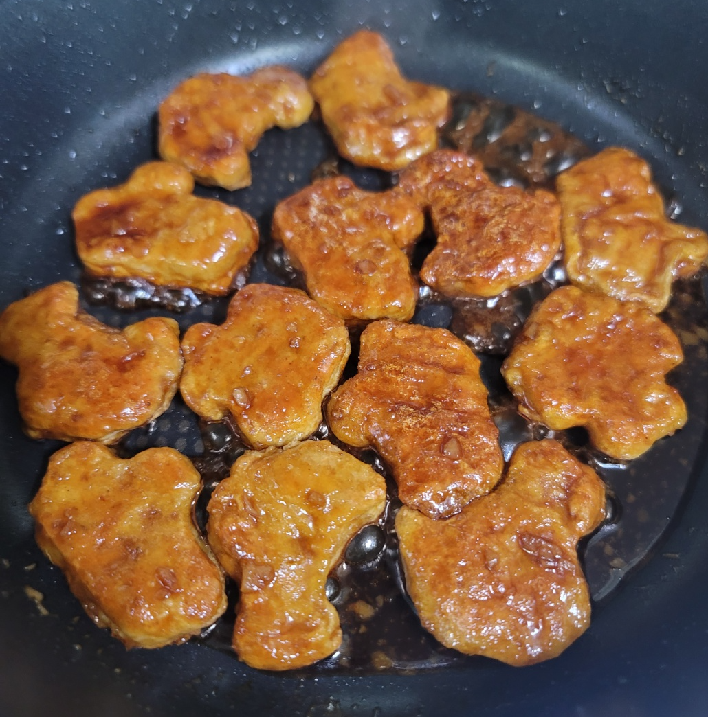 소스가 졸여질 때까지 뒤적여줍니다. 치킨너겟에 양념이 골고루 묻도록 뒤적여줍니다. 요리는 끝! 접시에 담아줍니다.
