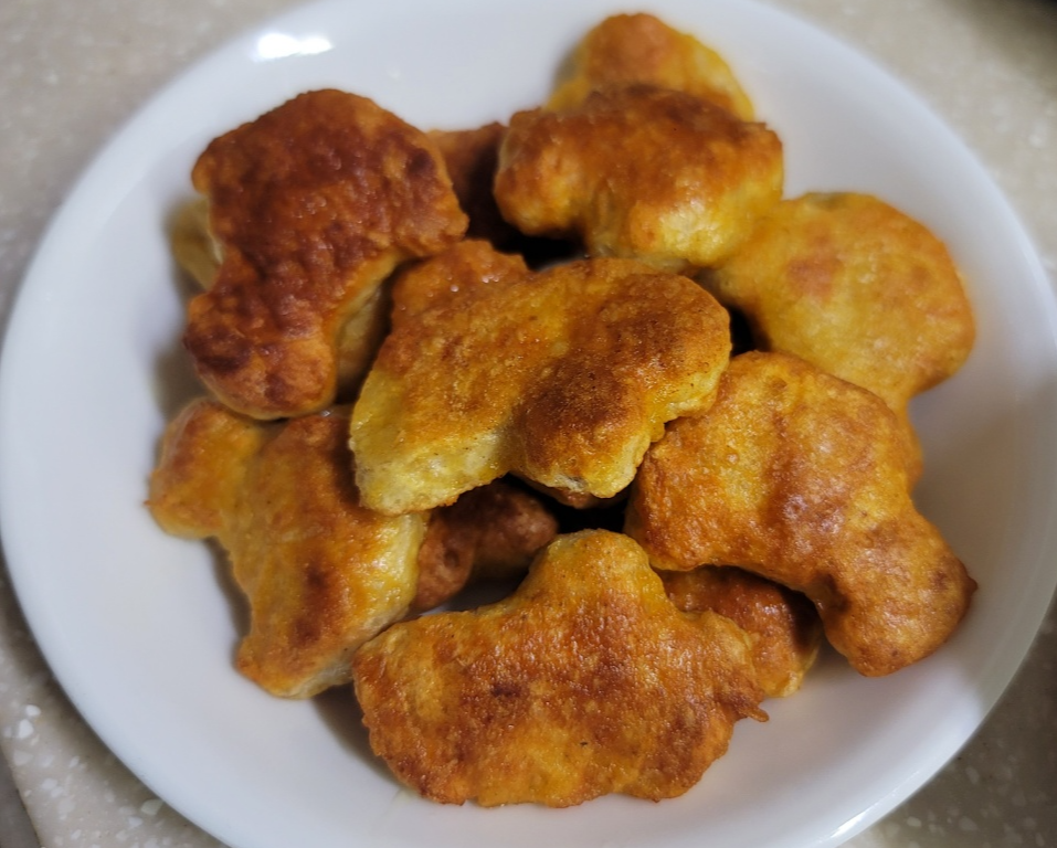 앞 뒤로 노릇노릇하게 맛있게 구워진 치킨너겟을 접시에 옮겨줍니다.